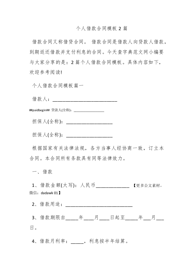 个人借款合同模板2篇此内容为付费资源,请付费后查看