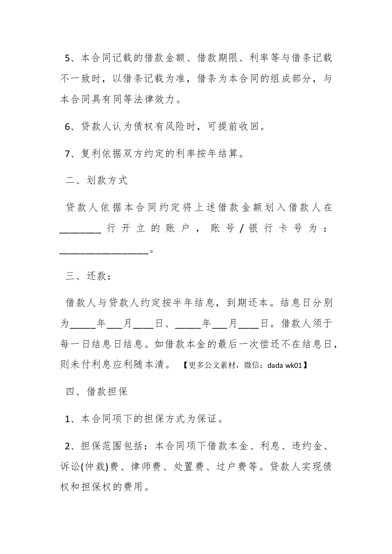 个人借款合同模板2篇借款合同又称借贷合同。借款合同是借款人向贷款人借款,到期返还借款并支付利息的合同。今天查字典范文网小编要与大家分享的是:2篇个人借款合同模板。具体内容如下,欢迎参考阅读!个人借款合同模板篇一借款人:#paidbegin#贷款人(全称):担保人(全称):担保人(全称):根据国家有关法律法规,各方当事人经协商一致,订立本合同。本合同所有条款具有同等法律效力。一、借款1、借款金额(大写):人民币【更多公文素材,微信:dadawk01】2、借款用途:3、借款期限自年月日起至年一月日。4、借款月利率:一一,利息按半年结算。