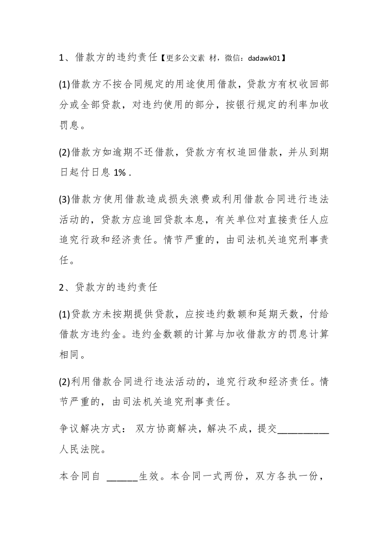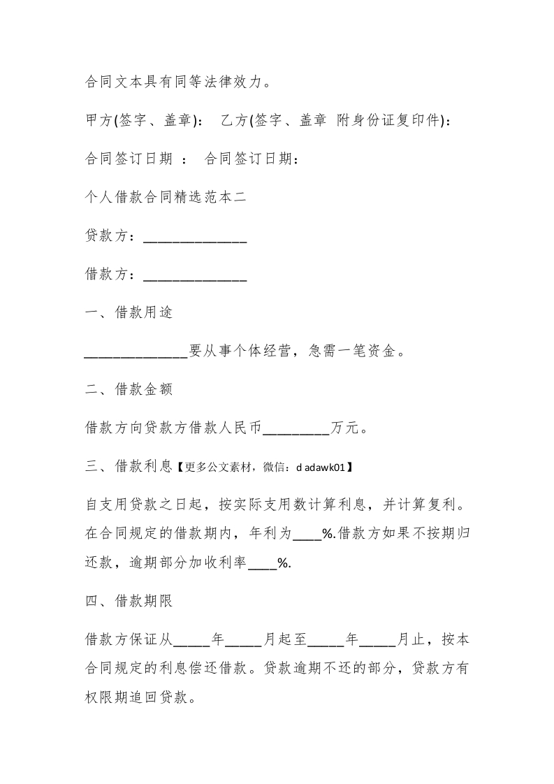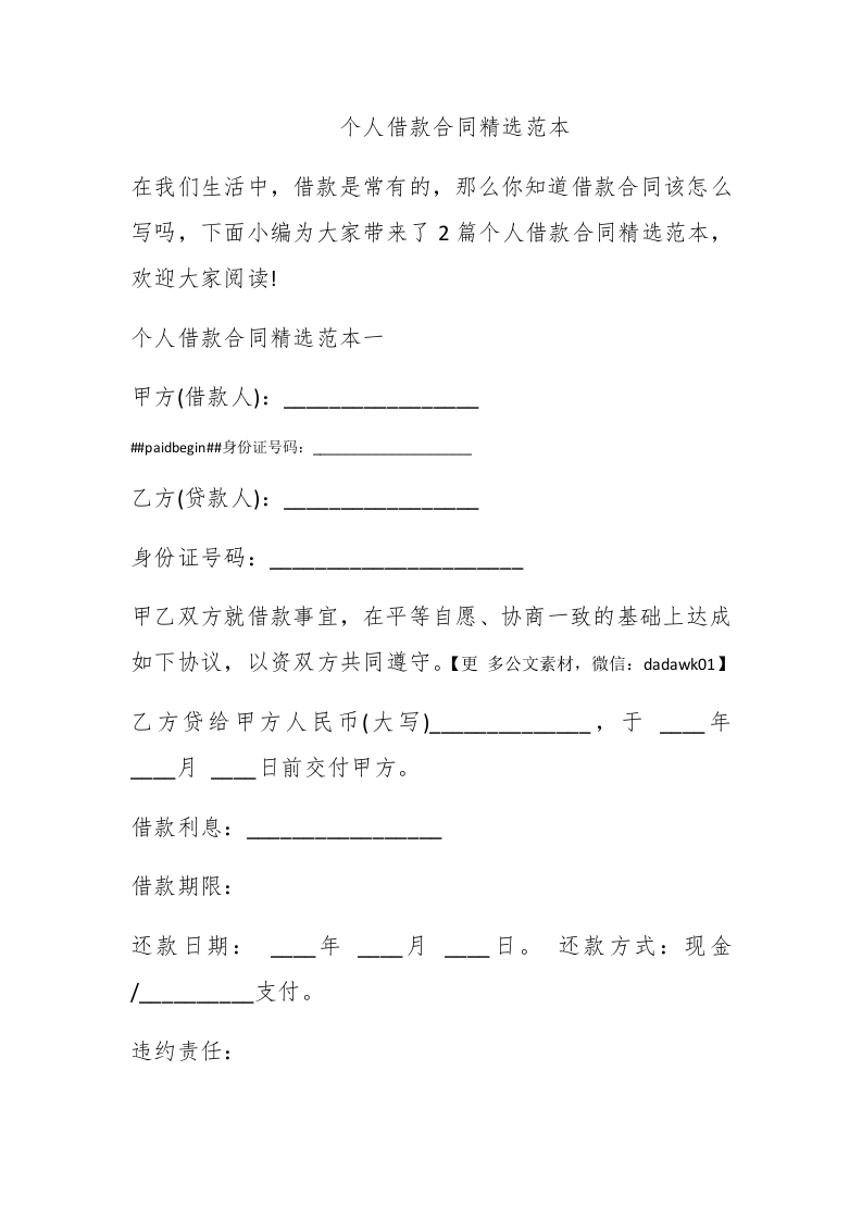 个人借款合同精选范本在我们生活中,借款是常有的,那么你知道借款合同该怎么写吗,下面小编为大家带来了2篇个人借款合同精选范本,欢迎大家阅读!个人借款合同精选范本一甲方(借款人):#paidbegin#身份证号码:乙方(贷款人):身份证号码:甲乙双方就借款事宜,在平等自愿、协商一致的基础上达成如下协议,以资双方共同遵守。【更多公文素材,微信:dadawk01】乙方贷给甲方人民币(大写)】年月日前交付甲方。借款利息:借款期限:还款日期:年月一一日。还款方式:现金支付。违约责任: