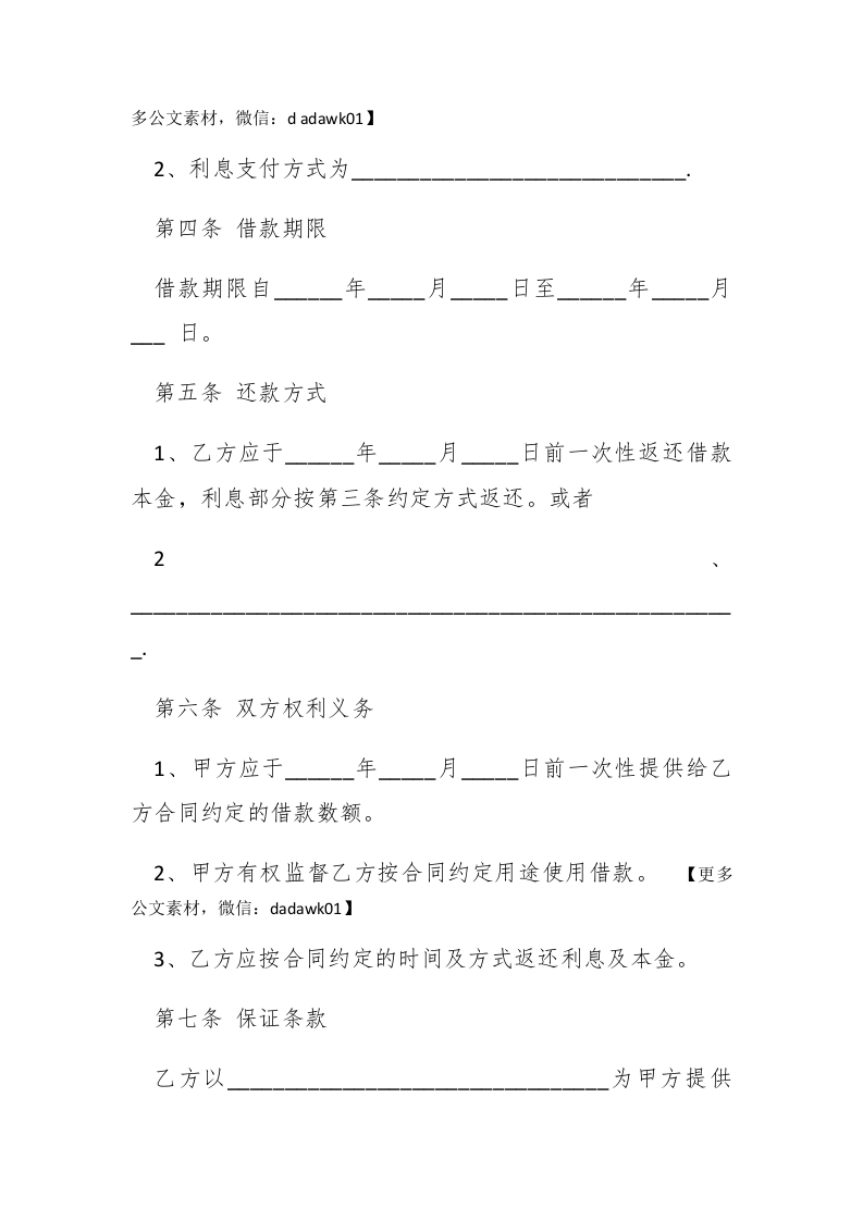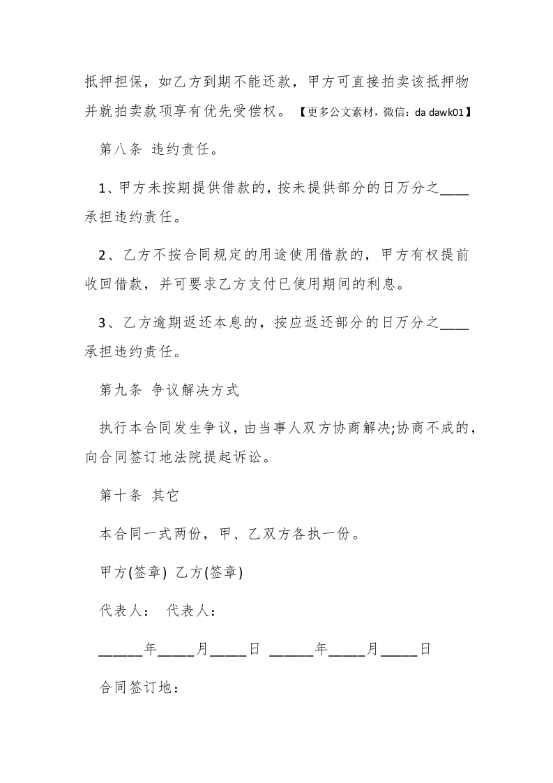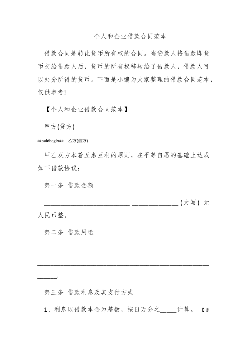 个人和企业借款合同范本借款合同是转让货币所有权的合同。当贷款人将借款即货币交给借款人后,货币的所有权移转给了借款人,借款人可以处分所得的货币。下面是小编为大家整理的借款合同范本,仅供参考!【个人和企业借款合同范本】甲方(贷方)#paidbegin#乙方(借方)甲乙双方本着互惠互利的原则,在平等自愿的基础上达成如下借款协议:第一条借款金额(大写)元人民币整。第二条借款用途第三条借款利息及其支付方式1、利息以借款本金为基数,按日万分之计算。【更