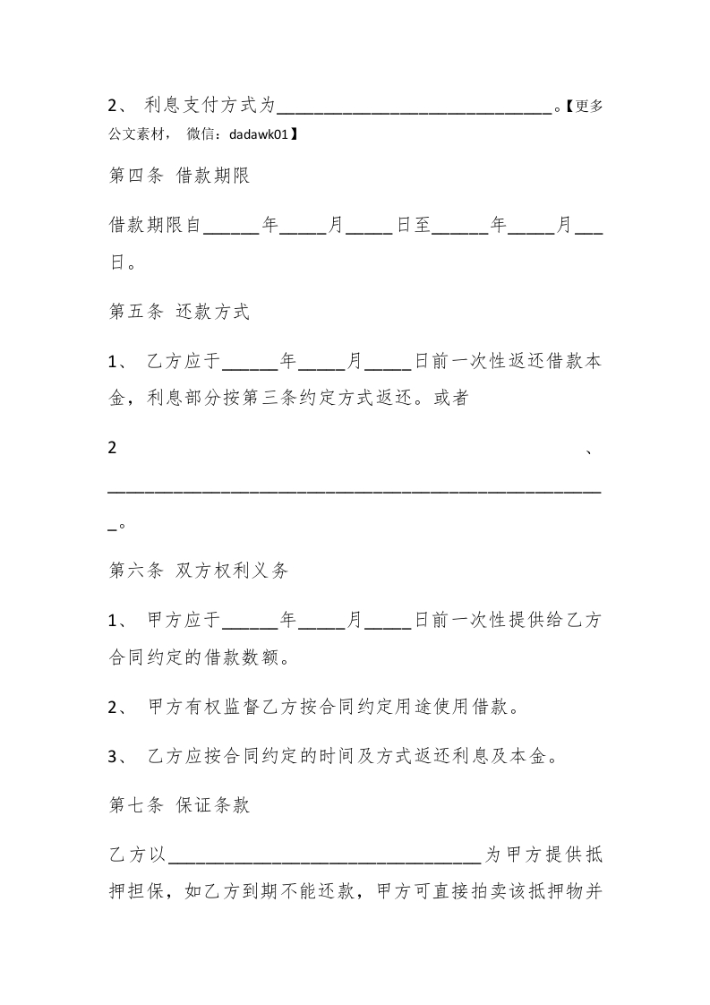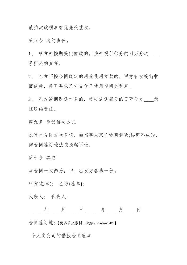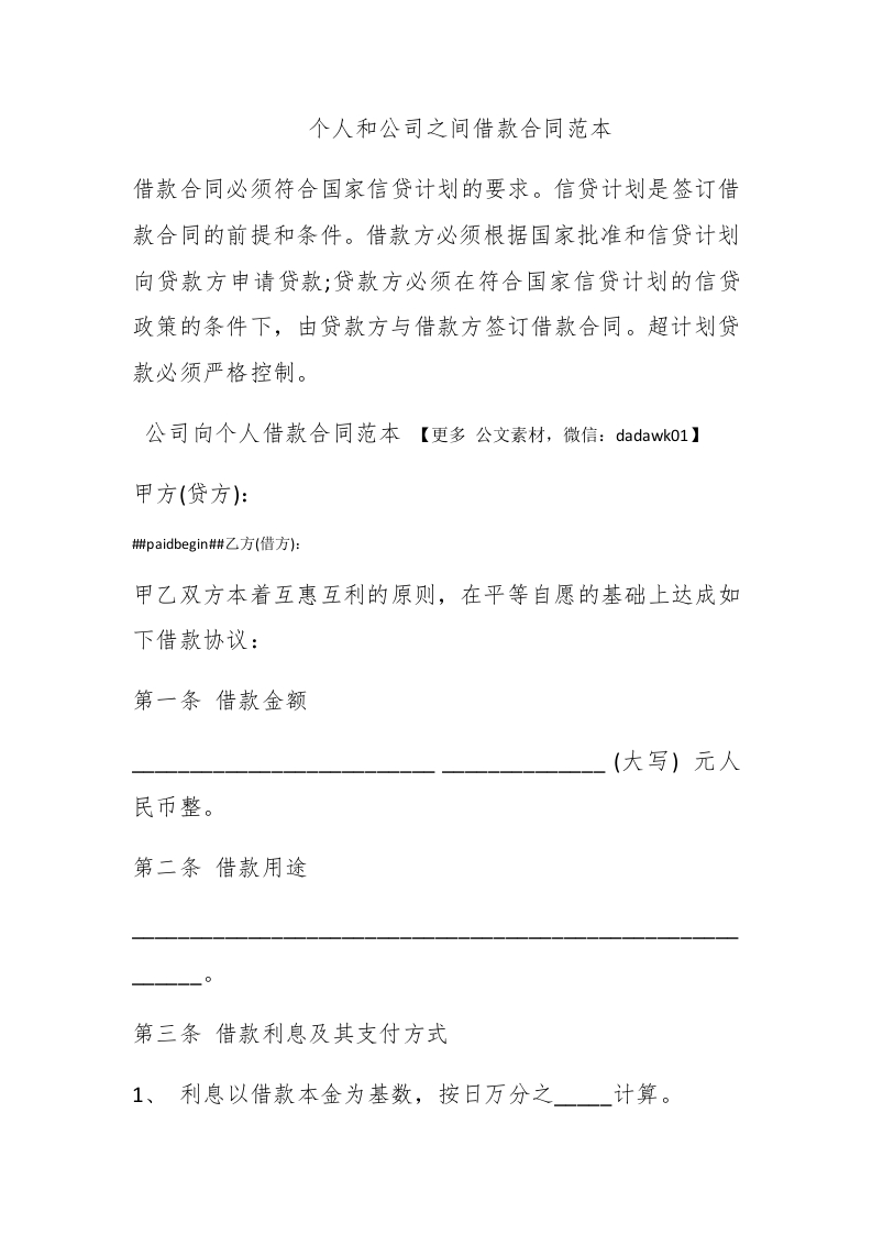 个人和公司之间借款合同范本借款合同必须符合国家信贷计划的要求。信贷计划是签订借款合同的前提和条件。借款方必须根据国家批准和信贷计划向贷款方申请贷款;贷款方必须在符合国家信贷计划的信贷政策的条件下,由贷款方与借款方签订借款合同。超计划贷款必须严格控制。公司向个人借款合同范本【更多公文素材,微信:dadawk01】甲方(贷方):#paidbegin#乙方(借方):甲乙双方本着互惠互利的原则,在平等自愿的基础上达成如下借款协议:第一条借款金额(大写)元人民币整。第二条借款用途第三条借款利息及其支付方式1、利息以借款本金为基数,按日万分之计算。