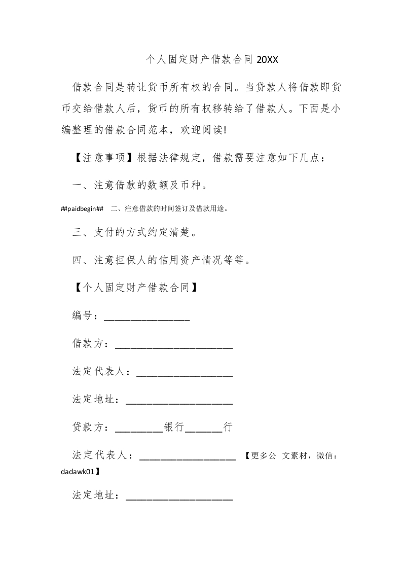 个人固定财产借款合同20XX借款合同是转让货币所有权的合同。当贷款人将借款即货币交给借款人后,货币的所有权移转给了借款人。下面是小编整理的借款合同范本,欢迎阅读!【注意事项】根据法律规定,借款需要注意如下几点:一、注意借款的数额及币种。郴paidbegin#二、注意借款的时间签订及借款用途。三、支付的方式约定清楚。四、注意担保人的信用资产情况等等。【个人固定财产借款合同】编号:借款方:法定代表人:法定地址:贷款方:银行」行法定代表人:【更多公文素材,微信:dadawk01】法定地址: