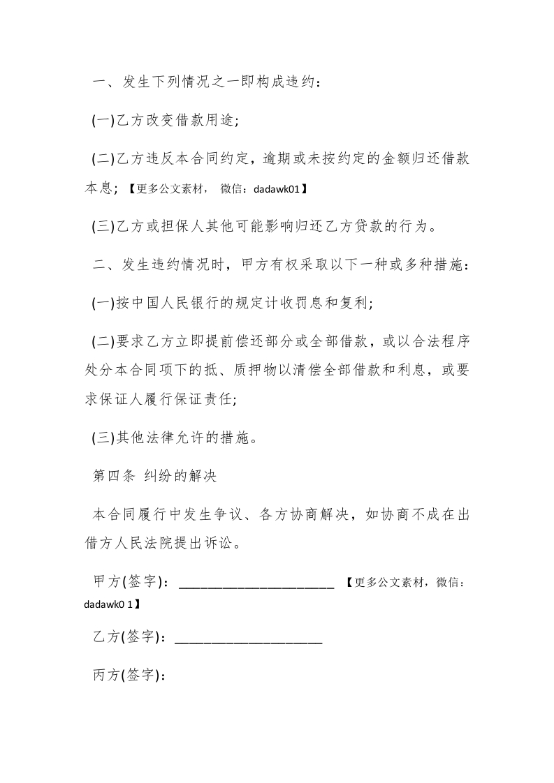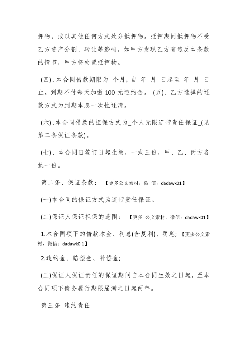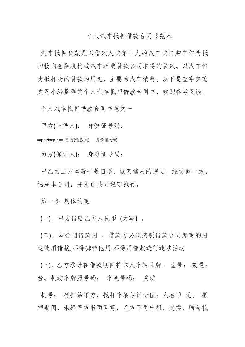 个人汽车抵押借款合同书范本汽车抵押贷款是以借款人或第三人的汽车或自购车作为抵押物向金融机构或汽车消费贷款公司取得的贷款。以汽车作为抵押物的贷款的用途,主要为汽车消费。以下是查字典范文网小编整理的个人汽车抵押借款合同书,欢迎参考阅读。个人汽车抵押借款合同书范文一甲方(出借人):身份证号码:#paidbegin#乙方(借款人):身份证号码:丙方(保证人):身份证号码:甲乙丙三方本着平等自愿、诚实信用的原则,经协商一致,达成本合同,并保证共同遵守执行。第一条具体约定:(一)、甲方借给乙方人民币(大写)。(二)、本合同借款用,借款方必须按照借款合同规定的用途使用借款,不得挪作他用,不得用借款进行违法活动(三)、乙方承诺在借款期间将本人车辆品牌:型号:数量:台。机动车牌照号码:车架号码:发动机号:抵押给甲方,抵押车辆估计价值:人名币元。抵押期间,未经甲方书面同意,乙方不得出租、变卖、赠与抵