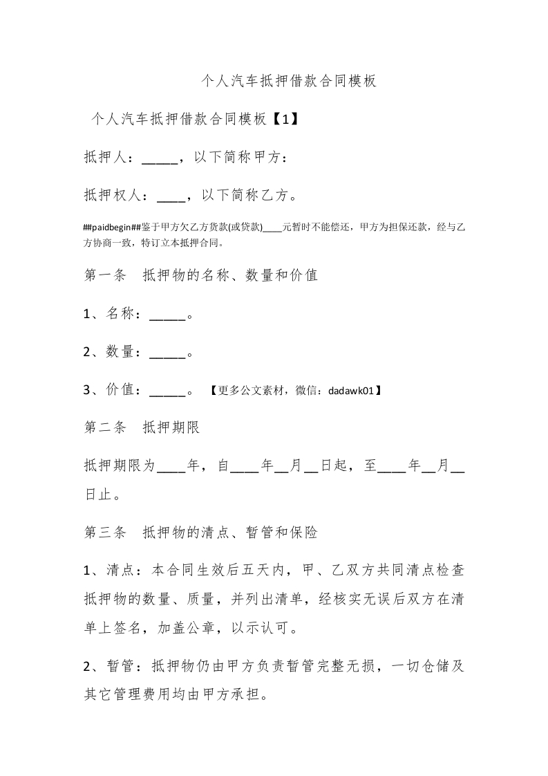 个人汽车抵押借款合同模板个人汽车抵押借款合同模板【1】抵押人:,以下简称甲方:抵押权人:,以下简称乙方。#paidbegin#鉴于甲方欠乙方货款(或贷款)元暂时不能偿还,甲方为担保还款,经与乙方协商一致,特订立本抵押合同。第一条抵押物的名称、数量和价值1、名称:2、数量:3、价值:【更多公文素材,微信:dadawk01】第二条抵押期限抵押期限为年,自一一年一月一日起,至一一年月日止。第三条抵押物的清点、暂管和保险1、清点:本合同生效后五天内,甲、乙双方共同清点检查抵押物的数量、质量,并列出清单,经核实无误后双方在清单上签名,加盖公章,以示认可。2、暂管:抵押物仍由甲方负责暂管完整无损,一切仓储及其它管理费用均由甲方承担。