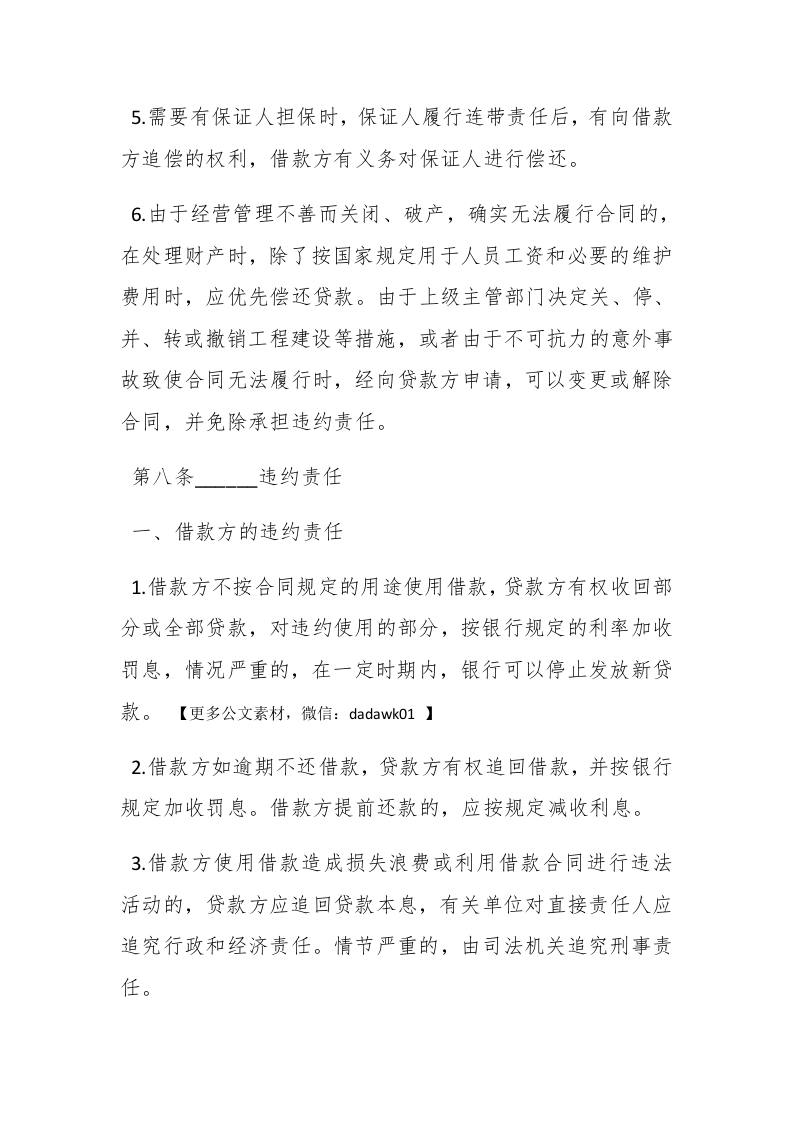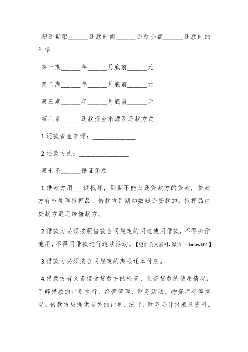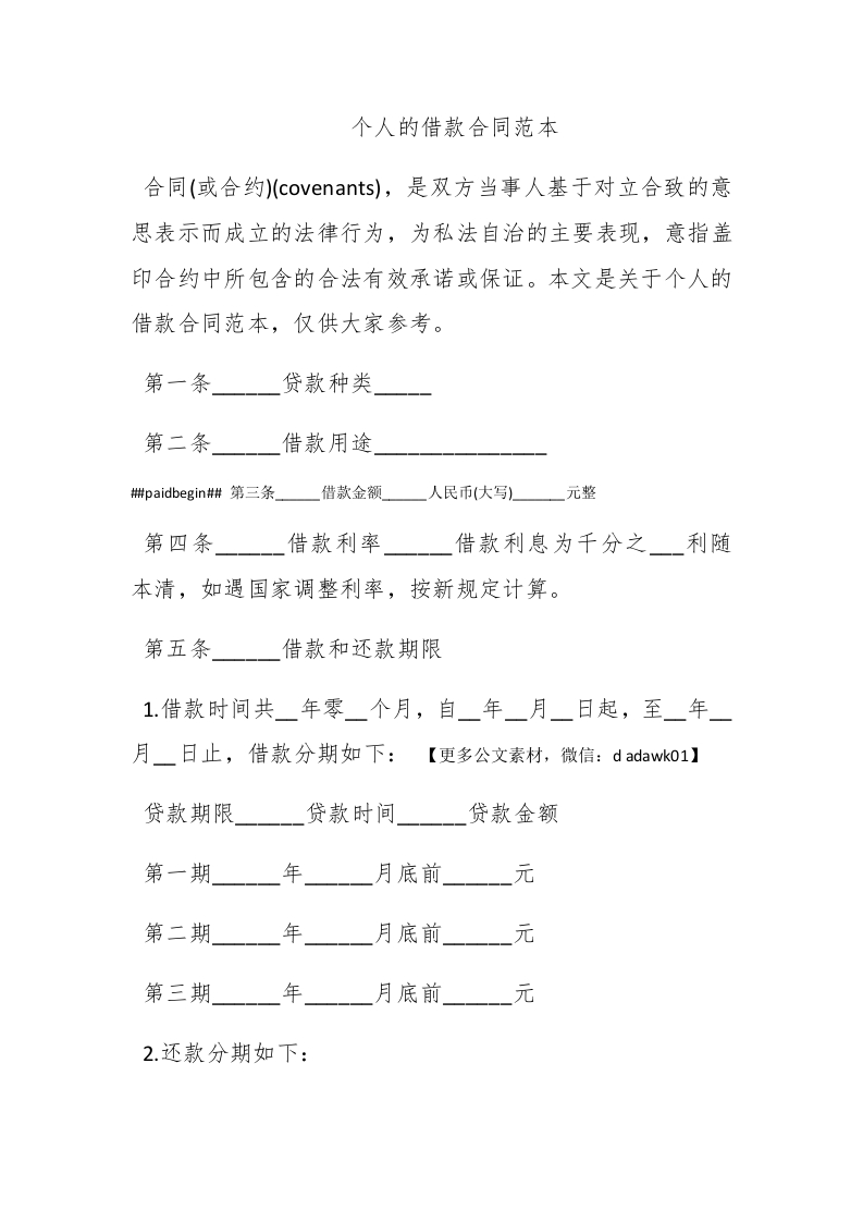 个人的借款合同范本合同(或合约)(covenants),是双方当事人基于对立合致的意思表示而成立的法律行为,为私法自治的主要表现,意指盖印合约中所包含的合法有效承诺或保证。本文是关于个人的借款合同范本,仅供大家参考。第一条贷款种类第二条借款用途#paidbegin#第三条」借款金额人民币(大写)】元整第四条借款利率借款利息为千分之利随本清,如遇国家调整利率,按新规定计算。第五条借款和还款期限1.借款时间共年零个月,自年一月一日起,至一年月日止,借款分期如下:【更多公文素材,微信:d adawk01】贷款期限贷款时间贷款金额第一期年月底前元第二期年】月底前元第三期年月底前元2.还款分期如下: