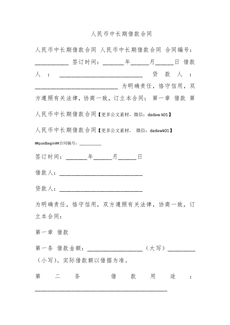 人民币中长期借款合同人民币中长期借款合同人民币中长期借款合同合同编号:签订时间:年月日借款贷款人:为明确责任,恪守信用,双方遵照有关法律,协商一致,订立本合同:第一章借款第人民币中长期借款合同【更多公文素材,微信:dadaw ko1】人民币中长期借款合同【更多公文素材,微信:dadawk01】#paidbegin#合同编号:签订时间:日借款人:贷款人:为明确责任,恪守信用,双方遵照有关法律,协商一致,订立本合同:第一章借款第一条借款金额:(大写)(小写)。实际借款额以借据为准。第条借款用途