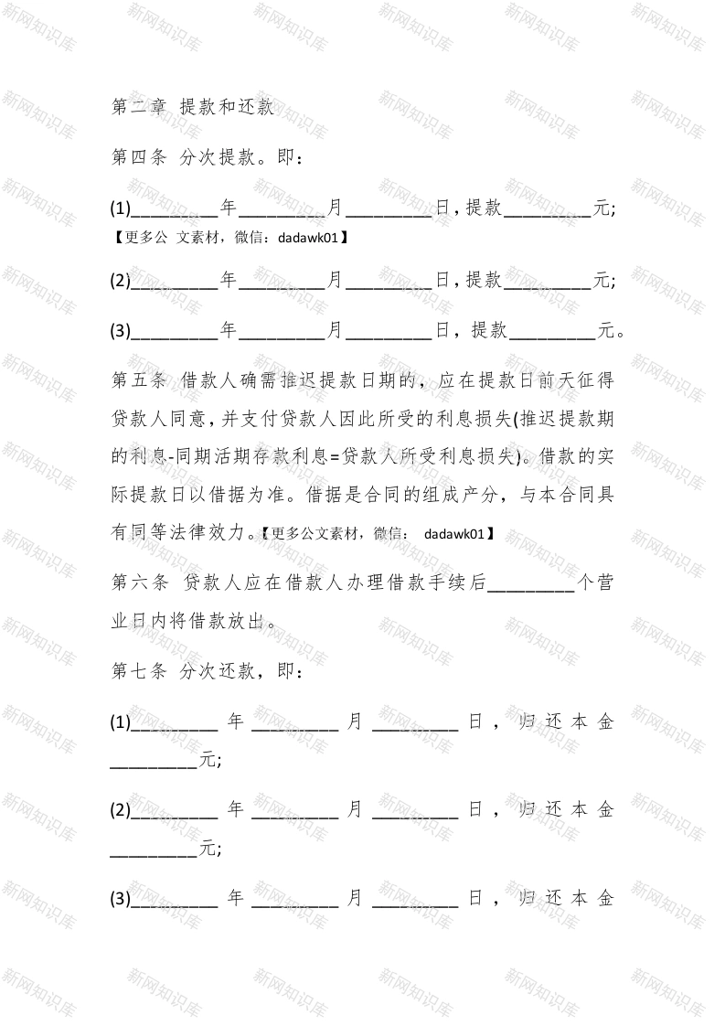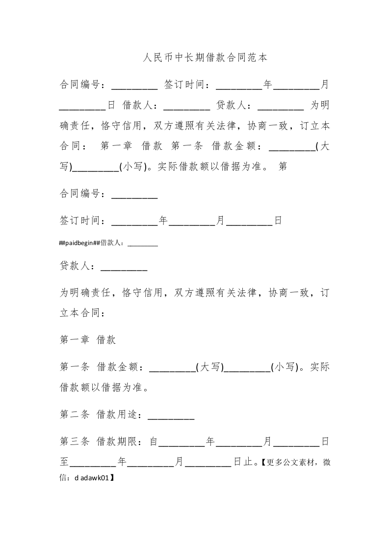 人民币中长期借款合同范本合同编号:签订时间:年月日借款人:贷款人:为明确责任,恪守信用,双方遵照有关法律,协商一致,订立本合同:第一章借款第一条借款金额:(大写)】(小写)。实际借款额以借据为准。第合同编号:签订时间:年月日#paidbegin#借款人:贷款人:为明确责任,恪守信用,双方遵照有关法律,协商一致,订立本合同:第一章借款第一条借款金额:(大写)(小写)。实际借款额以借据为准。第二条借款用途:第三条借款期限:自年月日至年月日止。【更多公文素材,微信:d adawk(01】