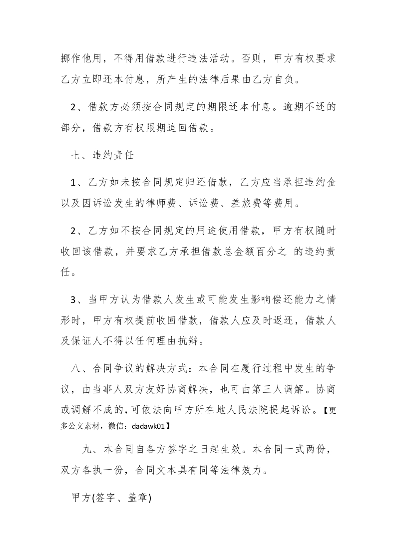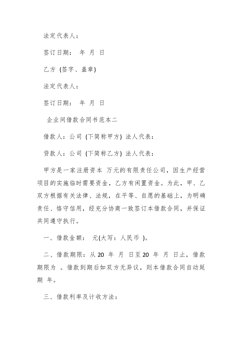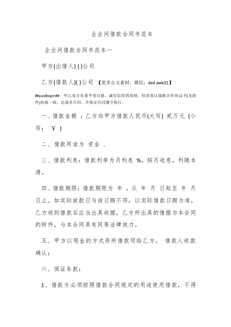 企业间借款合同书范本企业间借款合同书范本一甲方(出借人)()公司乙方(借款人)()公司【更多公文素材,微信:dad awko1】郴paidbegin#甲乙双方本着平等自愿、诚实信用的原则,经原签订战略合作协议书(见附件)协商一致,达成本合同,并保证共同遵守执行。一、借款金额:乙方向甲方借款人民币(大写)贰万元(小写:¥)二、借款用途为资金·三、借款利息:借款利率为月利息%,按月收息,利随本清。四、借款期限:借款期限为年,从年月日起至年月日止。如实际放款日与该日期不符,以实际借款日期为准。乙方收到借款后应当出具收据,乙方所出具的借据为本合同的附件,与本合同具有同等法律效力。五、甲方以现金的方式将所借款项给乙方。借款人收款确认:六、保证条款:1、借款方必须按照借款合同规定的用途使用借款,不得
