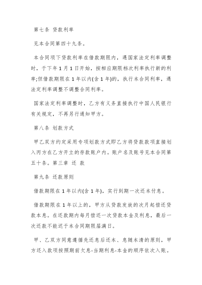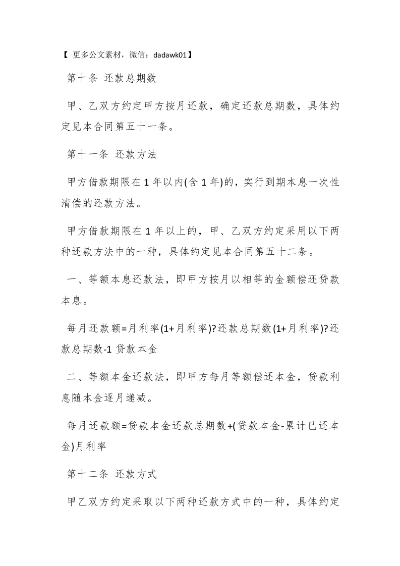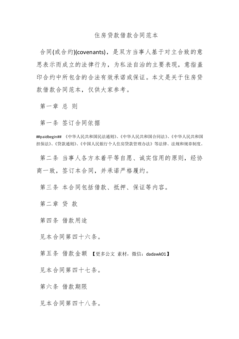 住房贷款借款合同范本合同(或合约)(covenants),是双方当事人基于对立合致的意思表示而成立的法律行为,为私法自治的主要表现,意指盖印合约中所包含的合法有效承诺或保证。本文是关于住房贷款借款合同范本,仅供大家参考。第一章总则第一条签订合同依据郴paidbegin#《中华人民共和国民法通则》、《中华人民共和国合同法》、《中华人民共和国担保法》、《贷款通则》、《中国人民银行个人住房贷款管理办法》等法律、法规和规章制度。第二条当事人各方本着平等自愿、诚实信用的原则,经协商一致,签订本合同,并承诺严格履约。第三条本合同包括借款、抵押、保证等内容。第二章贷款第四条借款用途见本合同第四十六条。第五条借款金额【更多公文素材,微信:dadawk01】见本合同第四十七条。第六条借款期限见本合同第四十八条。