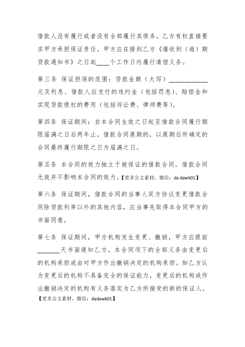 供借款保证用的担保合同范本合同编号:保证人(甲方):住所:擗paidbegin#法定代表人:【更多公文素材,微信:dada wk01】开户金融机构及账号:贷款银行(乙方):住所:法定代表人(或授权代理人):为确保乙方与签订的号借款同(以下简称借款合同)的履行,甲方愿意向乙方提供保证担保。乙双方根据《合同法》、《担保法》及其他有关规定,经协商一致;定如下条款:第一条甲方保证担保的贷款金额(大写)元,货款期限自年月日至月日。第二条本合同的保证人式为连带责任保证,甲方对借款合同中借款人的债务承担连带责任。如借款合同履行期限届满,
