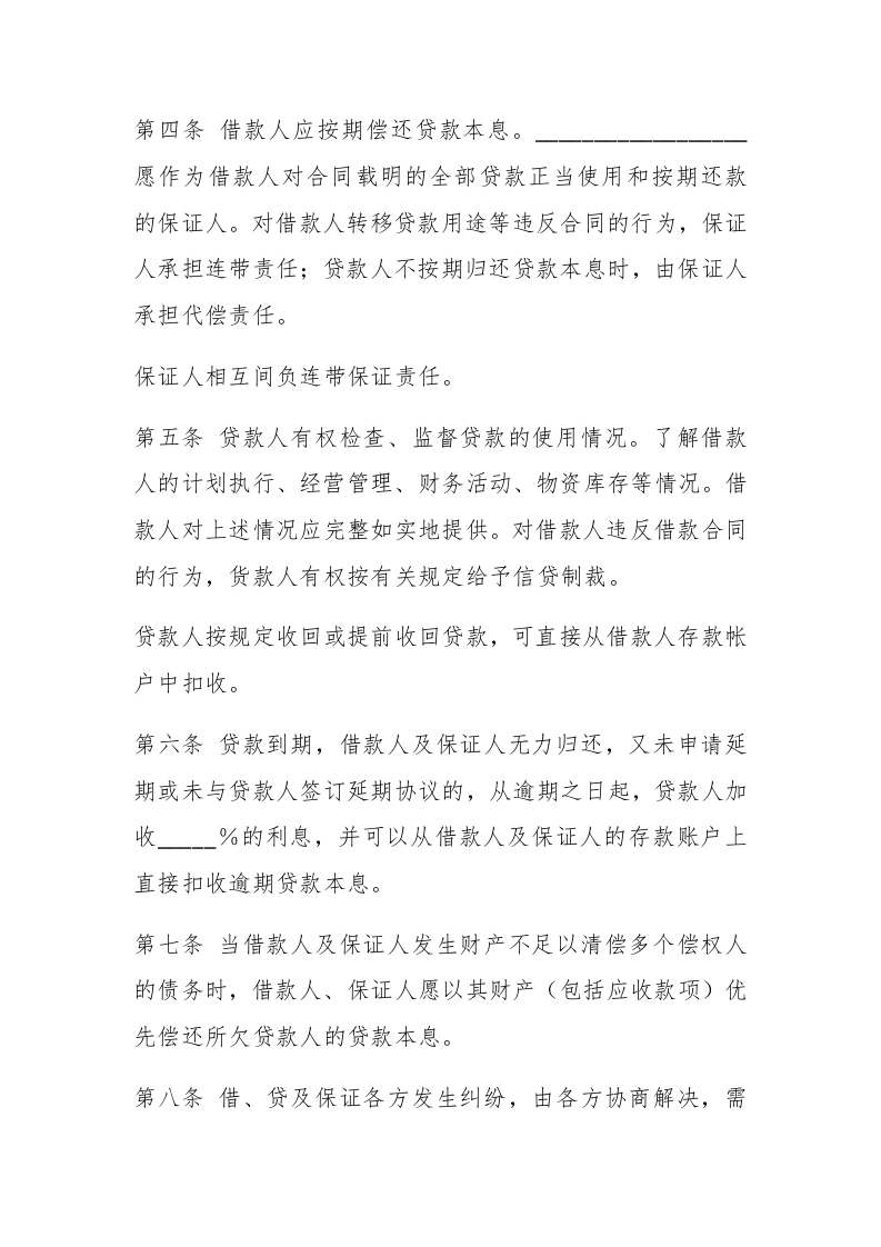保证担保借款合同(三)经(下称贷款人)(下称借款人)和(下称担保方)充分协商,根据《合同法》《担保法》及其他有关规定签订本合同,共同遵守。第一条自年月日起,由贷款人向借款人提供(种类)贷款(大写)经(下称贷款人)、(下称借款人)和(下称担保方)充分协商,根据《合同法》《担保法》及其他有关规定签订本合同,共同遵守。第一条自年月日起,由贷款人向借款人提供(种类)贷款(大写)元,用于还款期限至年月日止,利率按月息%计算。如遇国家贷款利率调整,按调整后的新利率和计息方法计算。具体用款、还款计划如下:第二条贷款人应在符合国家信贷政策、计划的前提下,按期、按额向借款人提供贷款。否则,应按违约数额和延期天数付给借款人违约金。违约金数额的计算,与逾期贷款的加息同。#paidbegin第三条借款人愿遵守贷款人的有关贷款办法规定,并按合同规定用途使用。否则,贷款人有权停止发放贷款,收回或提前收回己发放的贷款。对违约部分,按规定加收%利息。
