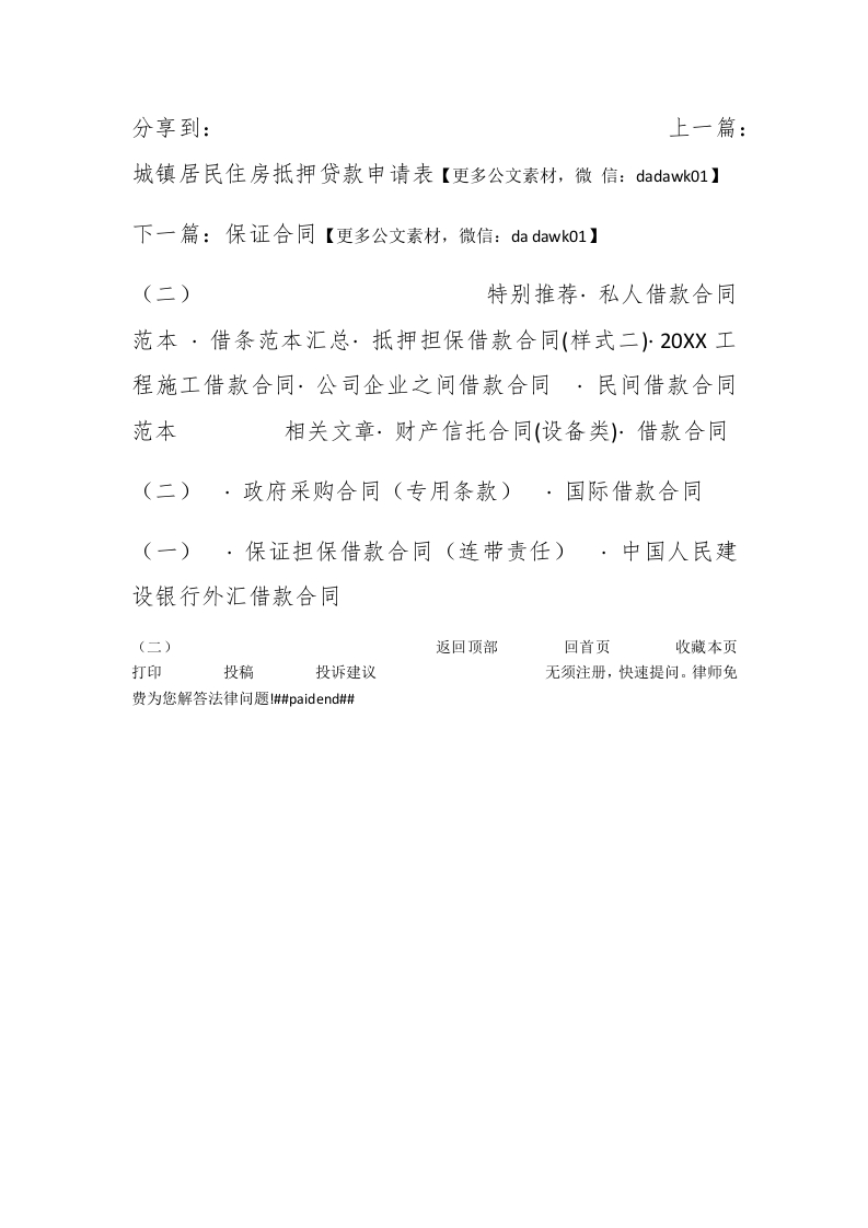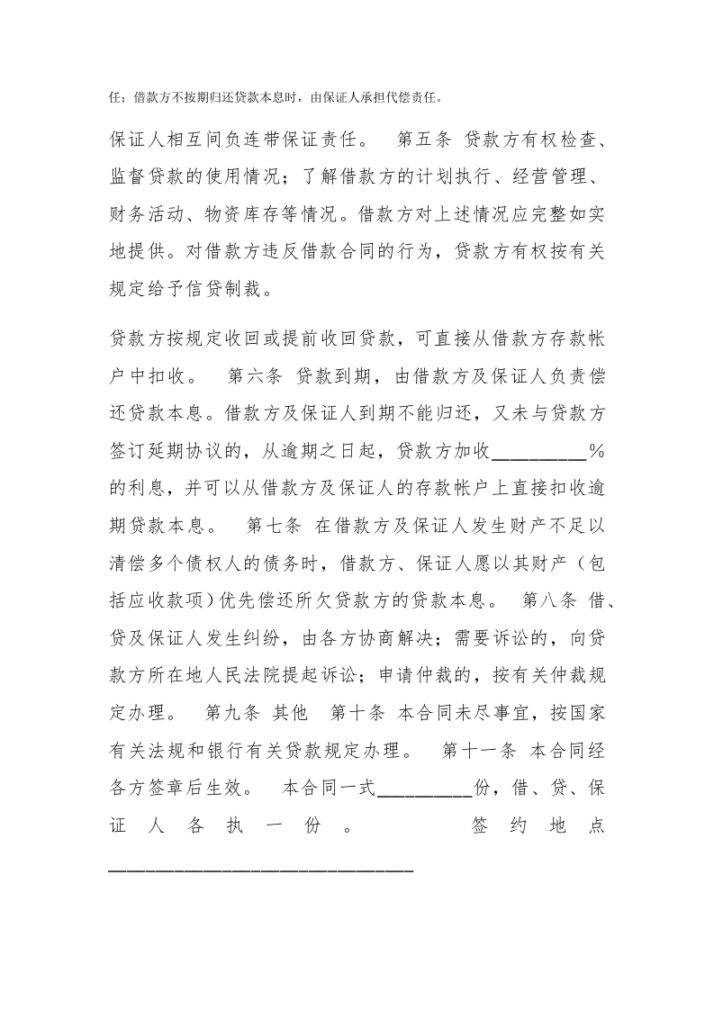 保证担保借款合同(二)经中国农业银行(下称贷款方)与(下称借款方)和(下称担保方)充分协商,根据《借款合同条例》和中国农业银行的有关规定签订本合同,共同遵守。第一条自年月日起,由贷款方向借款方提供(种经中国农业银行(下称贷款方)与(下称借款方)和(下称担保方)充分协商,根据《借款合同条例》和中国农业银行的有关规定签订本合同,共同遵守。第一条自年月日起,由贷款方向借款方提供(种类)贷款(大写)元,用于还款期限至年月日止,利率按月息%计算。如遇国家贷款利率调整,按调整后的新利率和计息方法计算。具体用款、还款计划如下:#paidbegin#分期用款计划分期还款计划日期金额日期金额第二条贷款方应在符合国家信贷政策、计划的前提下,按期、按额向借款方提供贷款。否则,应按违约数额和延期天数付给借款方违约金。违约金数额的计算,与逾期贷款的加息同。第三条借款方愿遵守贷款方的有关贷款办法规定,并按合同规定用途使用贷款。否则,贷款方有权停止发放贷款,收回或提前收回己发放的贷款。对违约部分,按规定加收%利息。第四条借款方应按期偿还贷款本息。愿作为借款方对合同载明的全部贷款正当使用和按期还款的保证人。对借款方转移贷款用途等违反合同的行为,保证人承担连带责