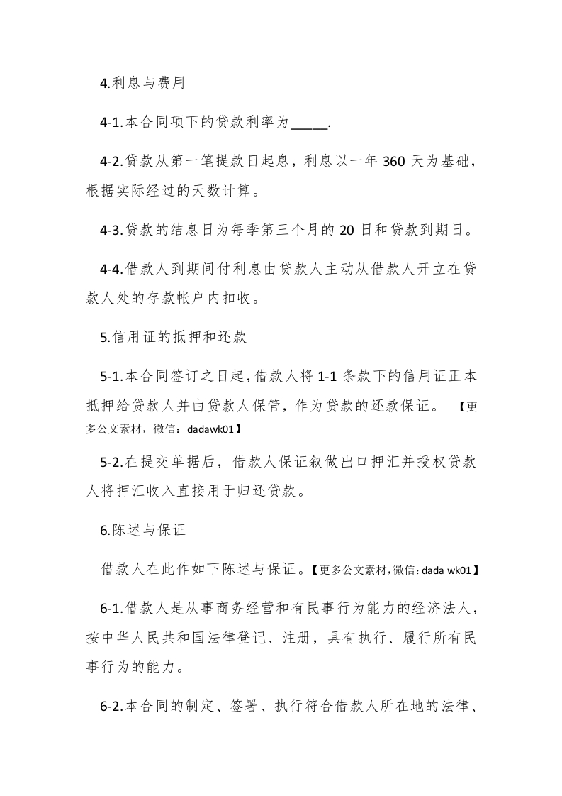 信用证抵押借款合同范文贷款人:法定地址:借款人:#paidbegin#法定地址:贷款人和借款人就借款人以信用证为抵押向贷款人申请外汇贷款一事共同协商签订合同如下:1.双方同意以下定义1-1.信用证:由银行开出通过通知编号为的信用证。1-2.债务:指借款人在本合同项下应付的贷款本金、利息及与此有关费用。2.贷款金额和用途2-1.本合同贷款金额的最高额为一2-2.本合同项下贷款限于借款人正常生产经营所需流动资金。3.期限3-1.本合同项下的贷款期限从合同签订日起个月。【更多公文素材,微信:dadawk01】
