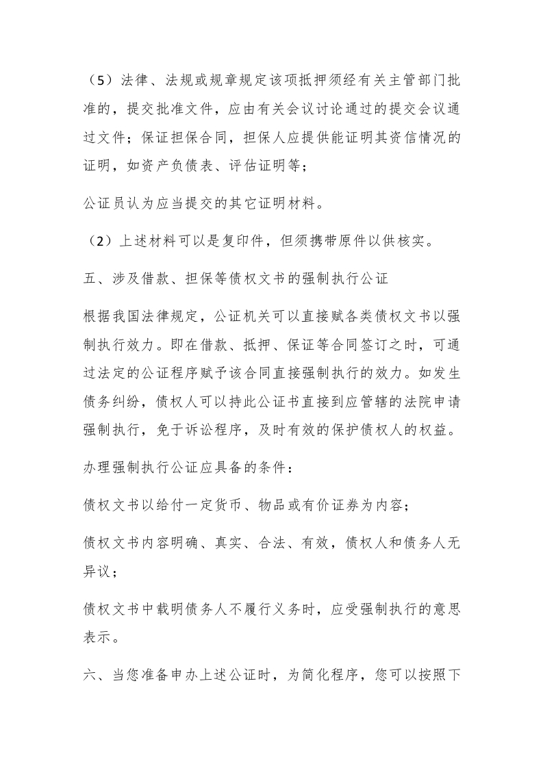 借款、担保合同公证一、借款合同、担保合同借款合同仅指金融机构同企事业单位和个人之间签订的货币借款合同。担保合同是借款合同的从合同,其签订是为了保障因借款合同所产生之债的履行和清偿。担保可以是一个单独的合同,也可以在借款合同中设定担保条款。担保可以是借款人以自己的财产一、借款合同、担保合同借款合同仅指金融机构同企事业单位和个人之间签订的货币借款合同。#paidbegin#担保合同是借款合同的从合同,其签订是为了保障因借款合同所产生之债的履行和清偿。担保可以是一个单独的合同,也可以在借款合同中设定担保条款。担保可以是借款人以自己的财产或权利进行抵押或质押担保,也可以是第三方为债务人以各种方式担保。二、借款合同公证、担保合同公证是公证机关根据借、贷双方或担保人、被担保人的申请,依法证明签署借款合同、担保合同的行为及合同本身的真实性、合法性的活动。三、办理借款合同、担保合同公证,应向合同签订地或当事人住所地公证处申请。北京市公证处负责办理北京市行政区域内(包括中央机关及企事业单位)各类国内、涉外、涉港、澳、台金融事务公证。目前,北京市公证处办理的金融事务公证主要包括借款合同公证、担保合同公证和涉及借款担保等债权文书的强制执行
