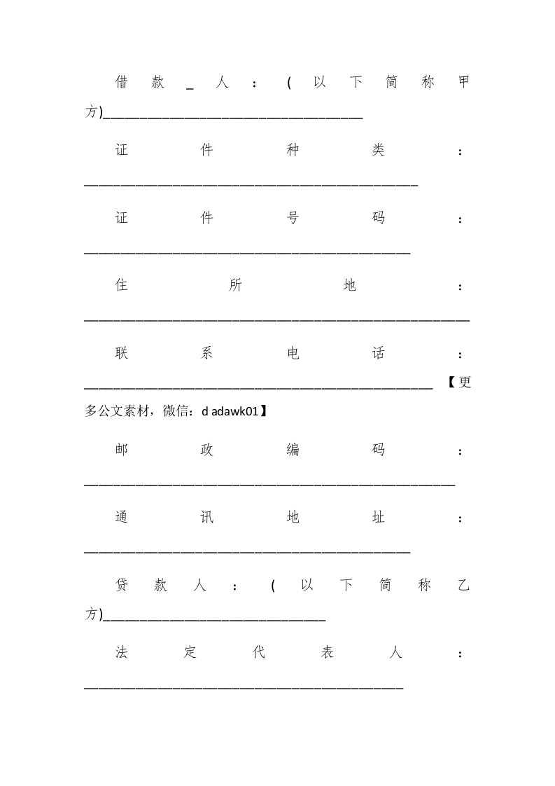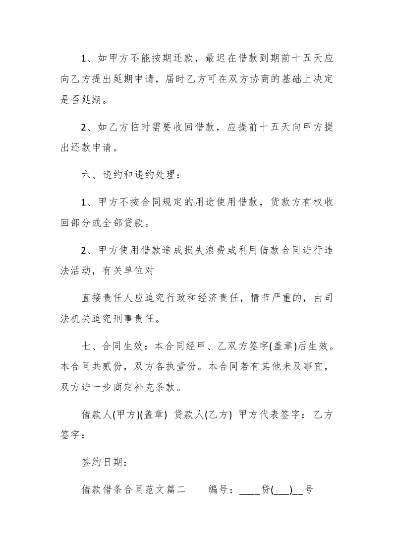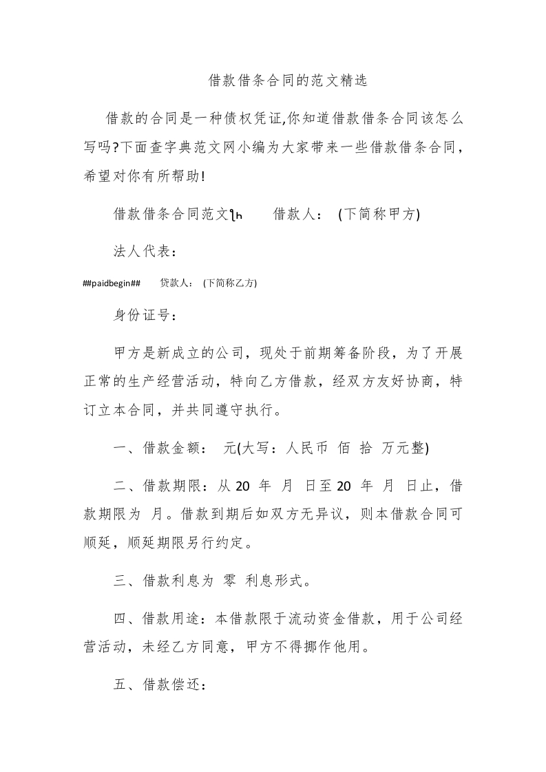 借款借条合同的范文精选借款的合同是一种债权凭证,你知道借款借条合同该怎么写吗?下面查字典范文网小编为大家带来一些借款借条合同,希望对你有所帮助!借款借条合同范文h借款人:(下简称甲方)法人代表:#paidbegin#贷款人:(下简称乙方)身份证号:甲方是新成立的公司,现处于前期筹备阶段,为了开展正常的生产经营活动,特向乙方借款,经双方友好协商,特订立本合同,并共同遵守执行。一、借款金额:元(大写:人民币佰拾万元整)二、借款期限:从20年月日至20年月日止,借款期限为月。借款到期后如双方无异议,则本借款合同可顺延,顺延期限另行约定。三、借款利息为零利息形式。四、借款用途:本借款限于流动资金借款,用于公司经营活动,未经乙方同意,甲方不得挪作他用。五、借款偿还: