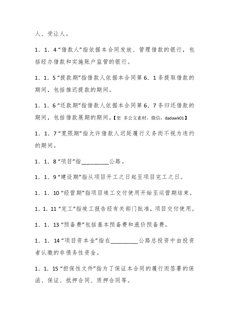 借款协议合同书范本合同编号:年字第号借款人:住所(地址):擗paidbegin#法定代表人:借款人:住所(地址):法定代表人(负责人):签订时间:年日签订地点:借款人因公路建设项目,向借款人申请人民币借款万元,期限为年。根据我国有关法律规定,经双方当事人平等协商,自愿签订本借款合同(以下简称“本合同”)。第一条定义与解释1.1在本合同中,下列术语具有如下含义:1.1.1“银行营业日”指借款人所在地法定工作日。1.1.3“借款人”指依据本合同借用借款的人,包括其继承