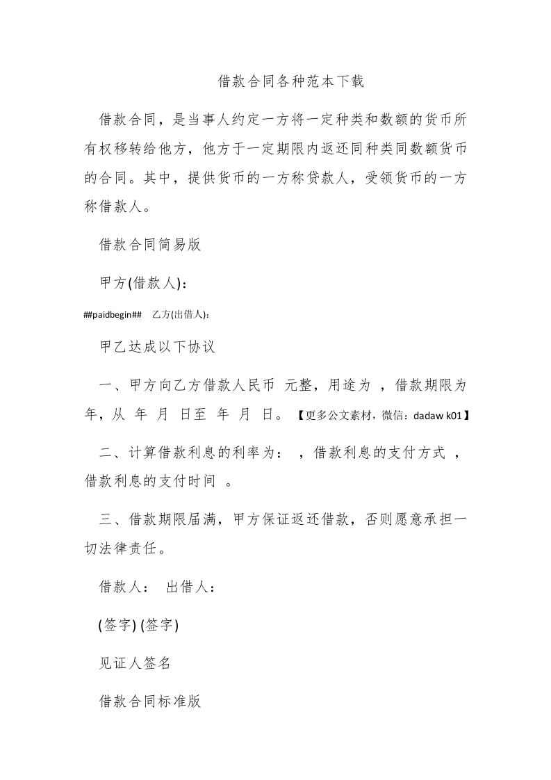 借款合同各种范本下载借款合同,是当事人约定一方将一定种类和数额的货币所有权移转给他方,他方于一定期限内返还同种类同数额货币的合同。其中,提供货币的一方称贷款人,受领货币的一方称借款人。借款合同简易版甲方(借款人):#paidbegin#乙方(出借人):甲乙达成以下协议一、甲方向乙方借款人民币元整,用途为,借款期限为年,从年月日至年月日。【更多公文素材,微信:dadaw ko1】二、计算借款利息的利率为:,借款利息的支付方式,借款利息的支付时间。三、借款期限届满,甲方保证返还借款,否则愿意承担一切法律责任。借款人:出借人:(签字)(签字)见证人签名借款合同标准版