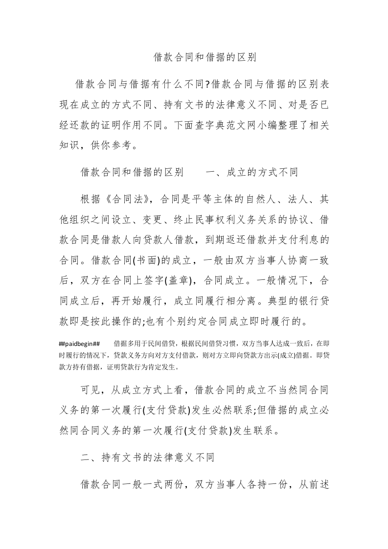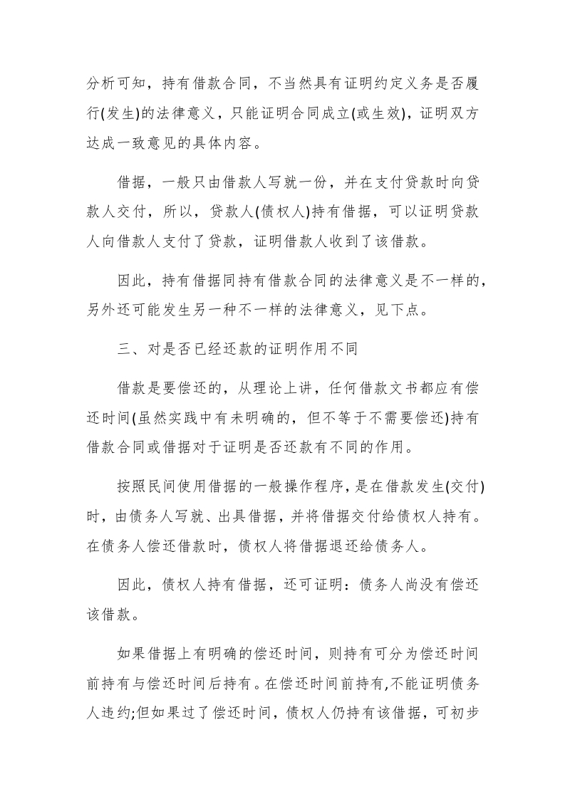 借款合同和借据的区别借款合同与借据有什么不同?借款合同与借据的区别表现在成立的方式不同、持有文书的法律意义不同、对是否已经还款的证明作用不同。下面查字典范文网小编整理了相关知识,供你参考。借款合同和借据的区别一、成立的方式不同根据《合同法》,合同是平等主体的自然人、法人、其他组织之间设立、变更、终止民事权利义务关系的协议、借款合同是借款人向贷款人借款,到期返还借款并支付利息的合同。借款合同(书面)的成立,一般由双方当事人协商一致后,双方在合同上签字(盖章),合同成立。一般情况下,合同成立后,再开始履行,成立同履行相分离。典型的银行贷款即是按此操作的;也有个别约定合同成立即时履行的。榭paidbegin#借据多用于民间借贷,根据民间借贷习惯,双方当事人达成一致后,在即时履行的情况下,贷款义务方向对方支付借款,则对方立即向贷款方出示(成立)借据。即贷款方持有借据,证明贷款行为肯定发生。可见,从成立方式上看,借款合同的成立不当然同合同义务的第一次履行(支付贷款)发生必然联系;但借据的成立必然同合同义务的第一次履行(支付贷款)发生联系。二、持有文书的法律意义不同借款合同一般一式两份,双方当事人各持一份,从前述