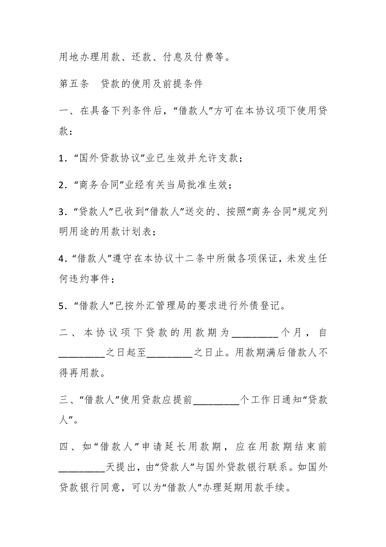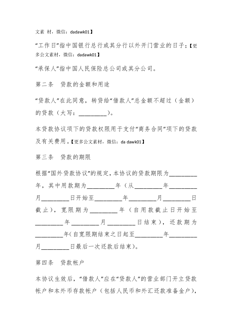 借款合同范本鉴于(借款人名称)向中国银行(分行名称)分行申请使用(贷款名称)贷款,根据中国银行与(国外银行名称)签订的国外贷款协议,(借款人名称)与中国银行(分行名称)分行于年月日在(签约地)签订本转贷款协议。双方一致同意如下:第一条定义除本协议另有规定外,本协议下列用语的定义如下:#paidbegin#“借款人”指」,其法定地址为“贷款人”指中国银行总行或中国银行分行,其法定地址为:“担保人”指其法定地址为“项目”指“商务合同”指作为买方的(公司名称)公司与作为卖方的(公司名称)公司于年月日签订的有关“项目”的商务合同(合同号为“国外贷款协议”指为了向“借款人”提供本贷款,“贷款人”同(银行名称)银行签订的本“项目”的信贷协议:【更多公