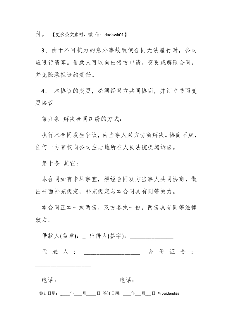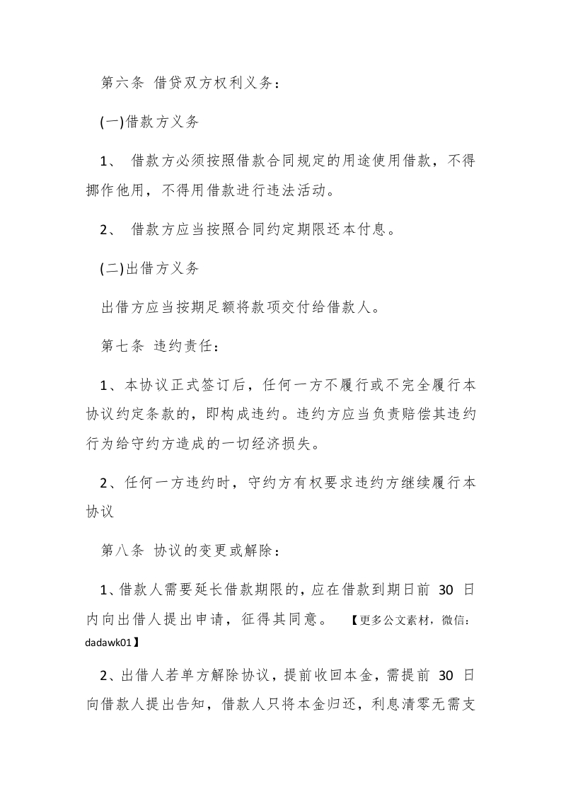 借款合同范本参考出借方:米米米米借款方:*米米米米米米米米米米米米米米米借款方为扩大生产经营,向出借方借款,经双方友好协商,特订立本合同,以昭信守。郴paidbegin#第一条借款用途:本合同所借款项用于公司经营活动。第二条借款金额:人民币**(¥***)元整。第三条借款利息采用固定利息形式,不随国家利率变化,年利息为百分之六。第四条借款和还款期限:1、借款时间共伍年,自20XX年4月10日起,至20XX年4月9日止。出借方将于20XX年4月10日之前,将该款项一次性交到借款方财务部门。2、还款时间与金额:【更多公文素材,微信:da dawk01】借款方还款时间为20XX年4月9日,本金和利息一并还清。3、借款方如当期在约定时间内未清当期款项应按日息计算,如还款日期超过30天应付当期还款金额10%违约金。第五条还款资金来源:公司账面金额。