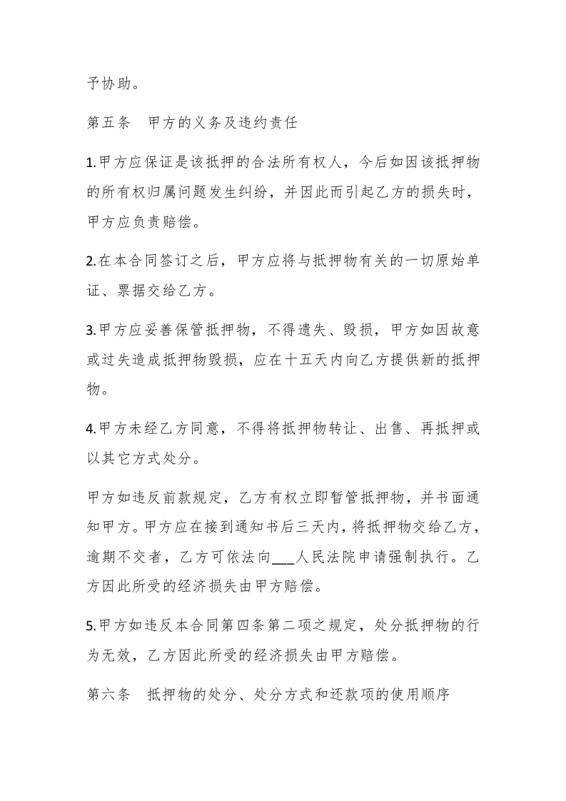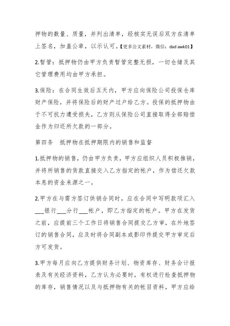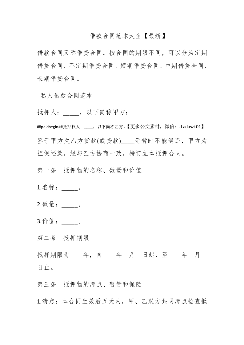 借款合同范本大全【最新】借款合同又称借贷合同。按合同的期限不同,可以分为定期借贷合同、不定期借贷合同、短期借贷合同、中期借贷合同、长期借贷合同。私人借款合同范本抵押人:,以下简称甲方:擗paidbegin#抵押权人:一,以下简称乙方。【更多公文素材,微信:d adawk01】鉴于甲方欠乙方货款(或贷款)元暂时不能偿还,甲方为担保还款,经与乙方协商一致,特订立本抵押合同。第一条抵押物的名称、数量和价值1.名称:2.数量:3.价值:0第二条抵押期限抵押期限为年,自年月日起,至一年一月日止。第三条抵押物的清点、暂管和保险1.清点:本合同生效后五天内,甲、乙双方共同清点检查抵