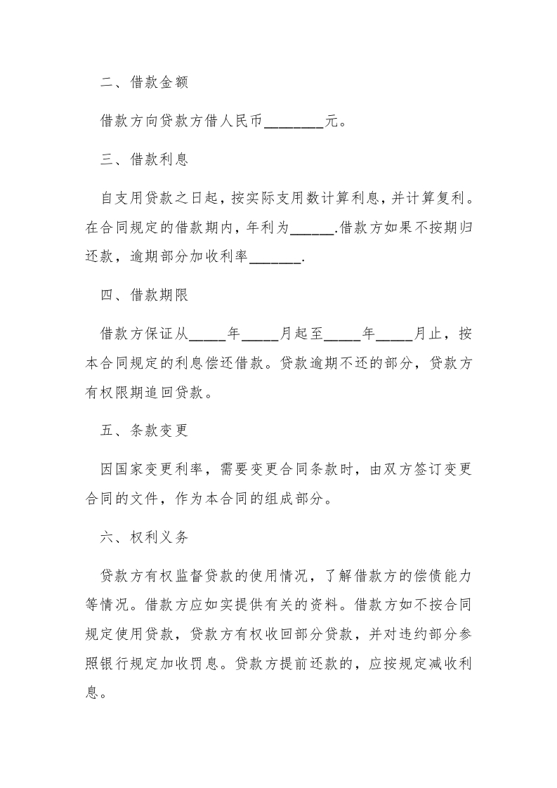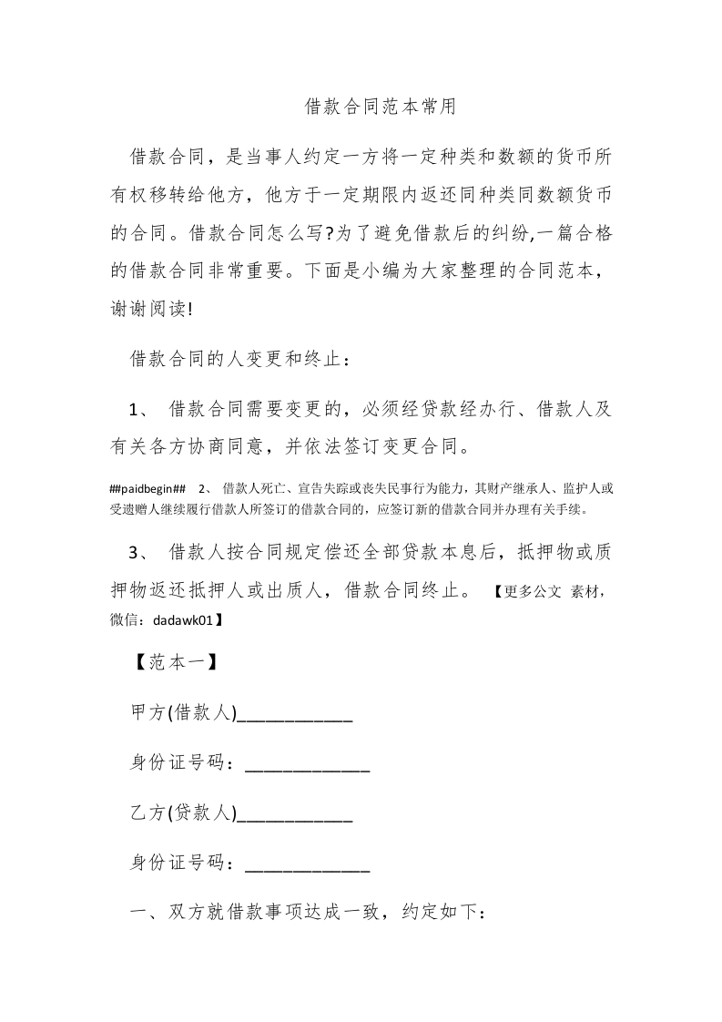 借款合同范本常用借款合同,是当事人约定一方将一定种类和数额的货币所有权移转给他方,他方于一定期限内返还同种类同数额货币的合同。借款合同怎么写?为了避免借款后的纠纷,一篇合格的借款合同非常重要。下面是小编为大家整理的合同范本,谢谢阅读!借款合同的人变更和终止:1、借款合同需要变更的,必须经贷款经办行、借款人及有关各方协商同意,并依法签订变更合同。郴paidbegin#2、借款人死亡、宣告失踪或丧失民事行为能力,其财产继承人、监护人或受遗赠人继续履行借款人所签订的借款合同的,应签订新的借款合同并办理有关手续。3、借款人按合同规定偿还全部贷款本息后,抵押物或质押物返还抵押人或出质人,借款合同终止。【更多公文素材,微信:dadawk01】【范本一】甲方(借款人)】身份证号码:乙方(贷款人)】身份证号码:一、双方就借款事项达成一致,约定如下: