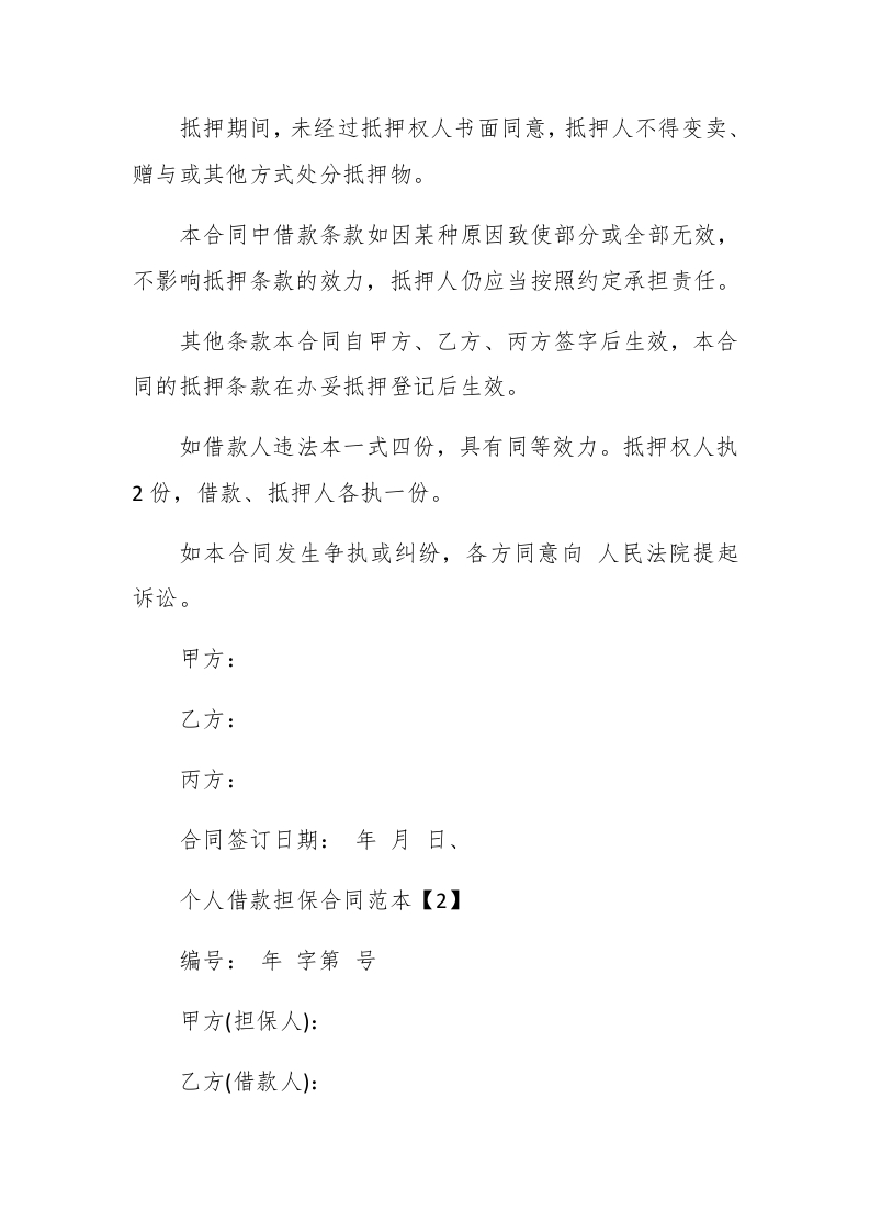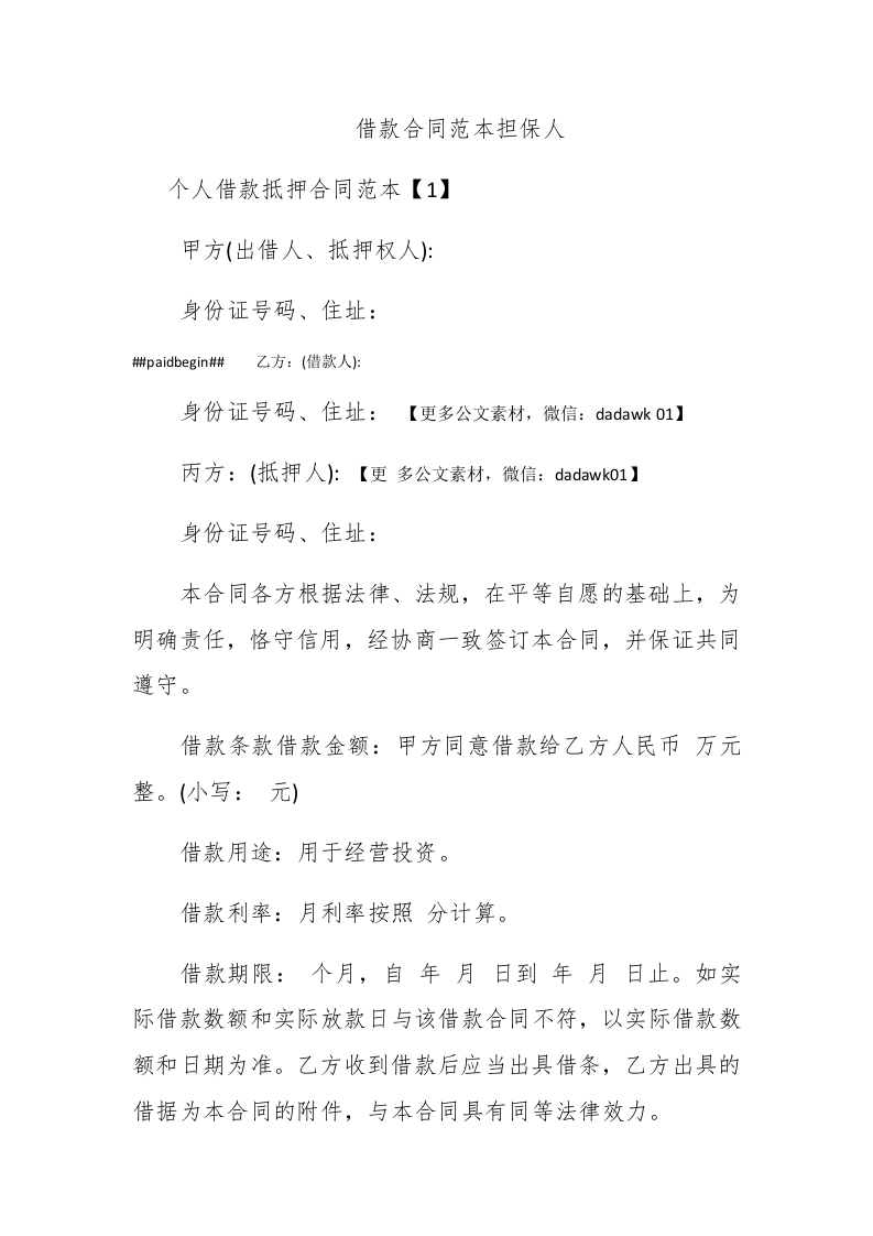 借款合同范本担保人个人借款抵押合同范本【1】甲方(出借人、抵押权人):身份证号码、住址:#paidbegin##乙方:(借款人身份证号码、住址:【更多公文素材,微信:dadawk 01】丙方:(抵押人):【更多公文素材,微信:dadawk01】身份证号码、住址:本合同各方根据法律、法规,在平等自愿的基础上,为明确责任,恪守信用,经协商一致签订本合同,并保证共同遵守。借款条款借款金额:甲方同意借款给乙方人民币万元整。(小写:元)借款用途:用于经营投资。借款利率:月利率按照分计算。借款期限:个月,自年月日到年月日止。如实际借款数额和实际放款日与该借款合同不符,以实际借款数额和日期为准。乙方收到借款后应当出具借条,乙方出具的借据为本合同的附件,与本合同具有同等法律效力。
