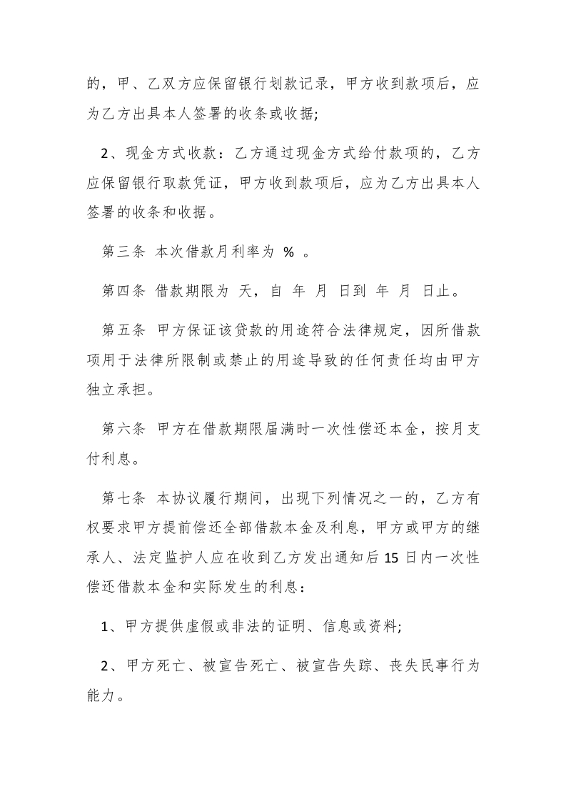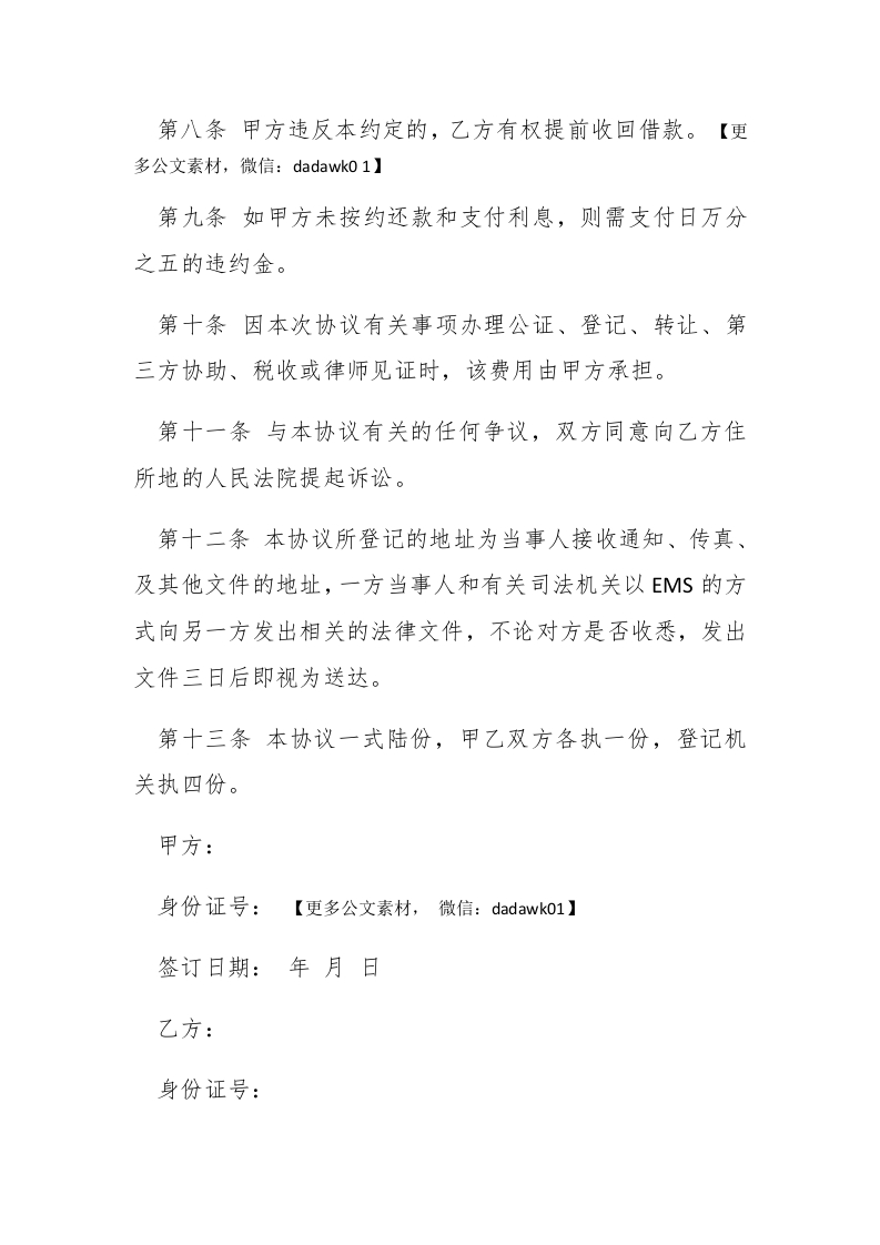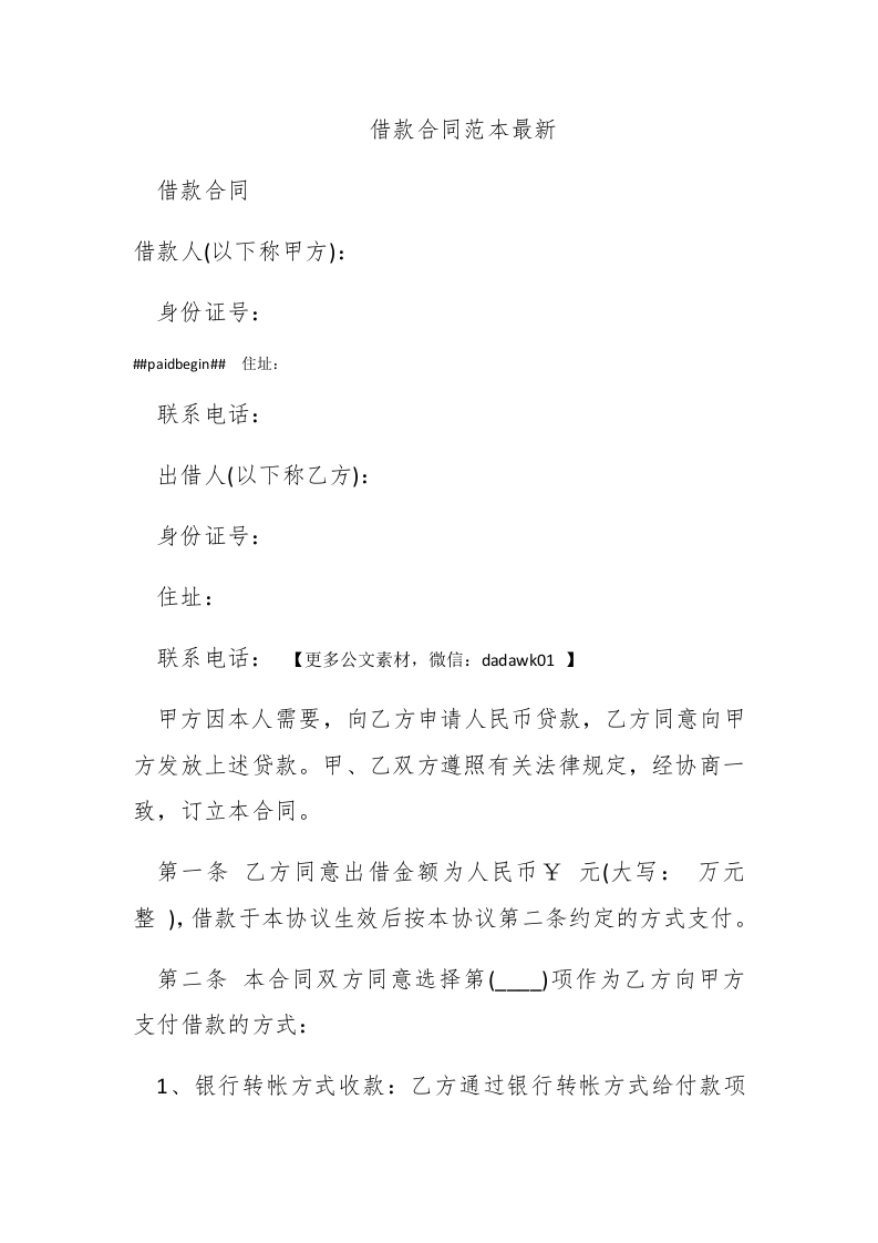 借款合同范本最新借款合同借款人(以下称甲方):身份证号:#paidbegin#住址:联系电话:出借人(以下称乙方):身份证号:住址:联系电话:【更多公文素材,微信:dadawko1】甲方因本人需要,向乙方申请人民币贷款,乙方同意向甲方发放上述贷款。甲、乙双方遵照有关法律规定,经协商一致,订立本合同。第一条乙方同意出借金额为人民币¥元(大写:万元整),借款于本协议生效后按本协议第二条约定的方式支付。第二条本合同双方同意选择第()项作为乙方向甲方支付借款的方式:1、银行转帐方式收款:乙方通过银行转帐方式给付款项