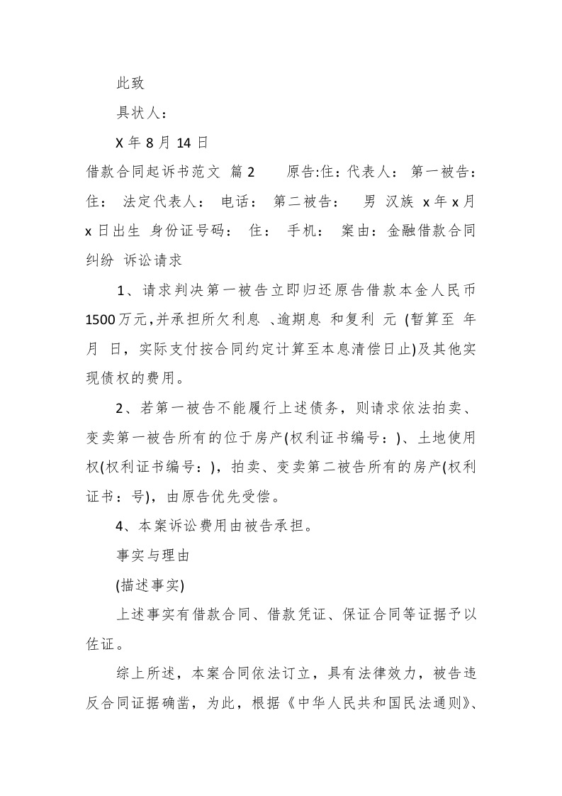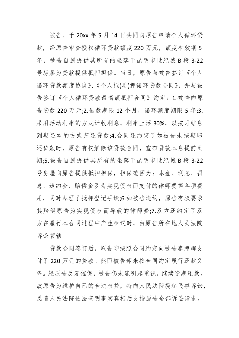 借款合同起诉书范文借款合同起诉书范文(通用15篇)借款合同起诉书范文篇1民事起诉状原告:法定代表人:住址:昆明市人民西路643号联系电话:被告:被告:被告:诉讼请求:1解除原告与被告签订的《个人循环贷款额度协议》;2.判令被告、立即偿还所欠原告贷款本金220xx00元;并按合同约定年利率、罚息标准向原告支付利息、罚息直至全部欠款还清为止(载止20xx年08月13日的利息为12973.46元,罚息为24998.91元):3.判令三被告赔偿原告为主张债权而发生的律师费67139元;4.判决确认原告对被告提供的坐落于昆明市世纪城B段3-22号的抵押物享有优先受偿权;5.由三被告承担本案诉讼费用。事实及理由: