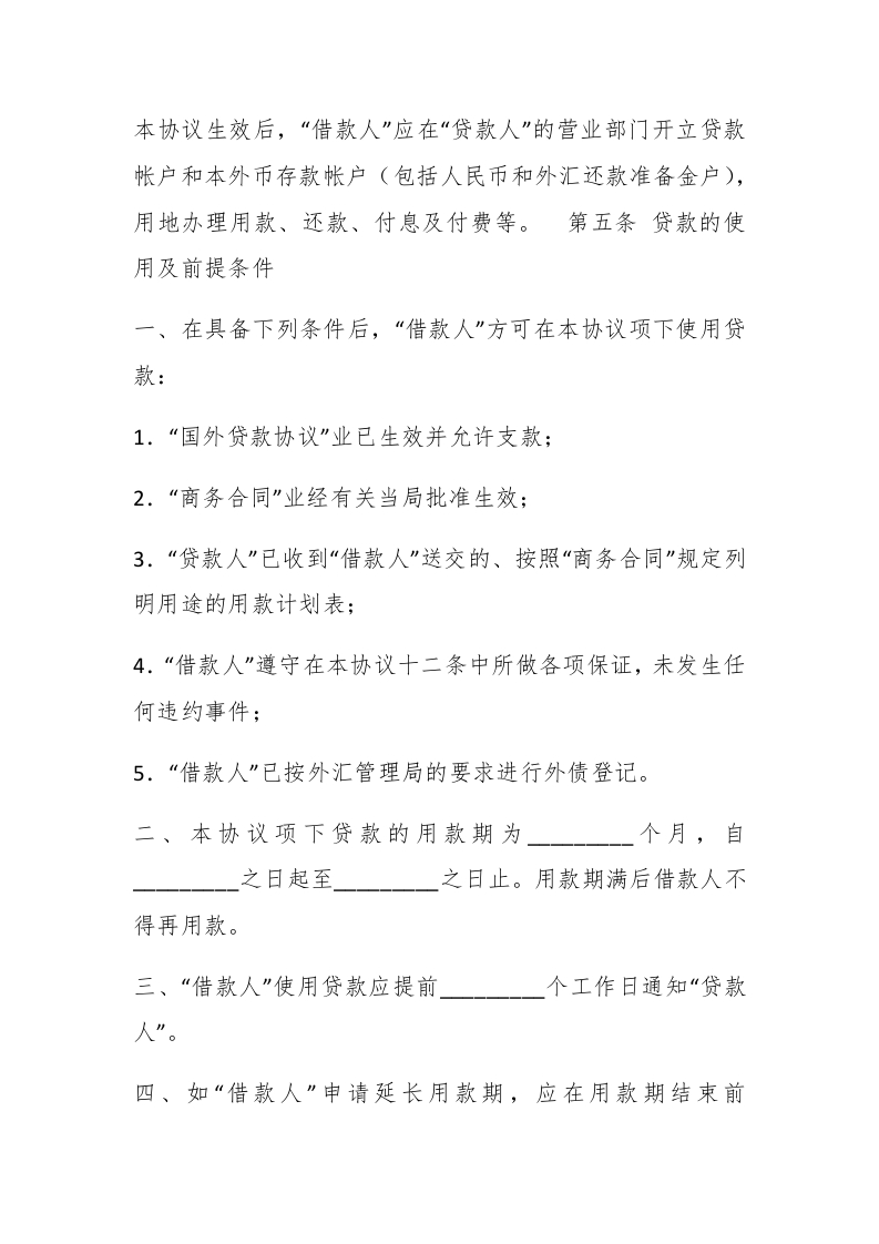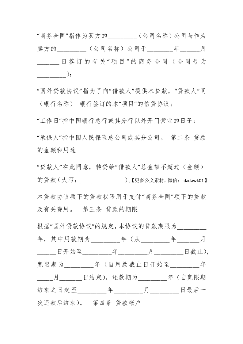 借款合同(七)鉴于(借款人名称)向中国银行(分行名称)分行申请使用(贷款名称)贷款,根据中国银行与(国外银行名称)签订的国外贷款协议,(借款人名称)与中国银行(分行名称)分行于年月日在鉴于(借款人名称)向中国银行(分行名称)分行申请使用(贷款名称)贷款,根据中国银行与(国外银行名称)签订的国外贷款协议,(借款人名称)与中国银行(分行名称)分行于年月日在(签约地)签订本转贷款协议。双方一致同意如下:第一条定义除本协议另有规定外,本协议下列用语的定义如下:#paidbegin#“借款人”指,其法定地址为“贷款人”指中国银行总行或中国银行分行,其法定地址为:”担保人”指其法定地址为;【更多公文素材,微信:da dawko1】项目指