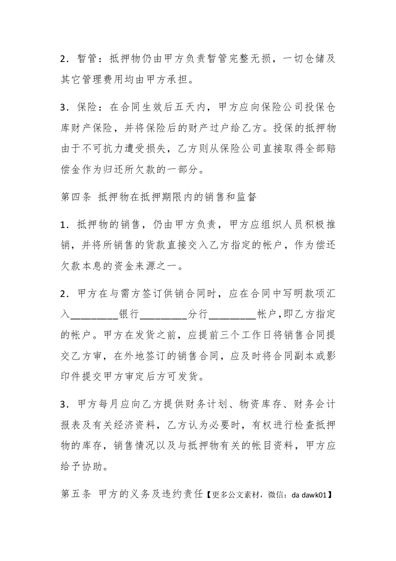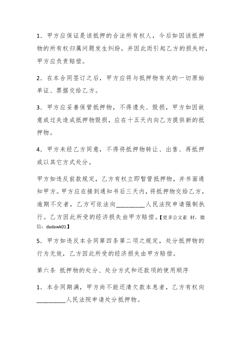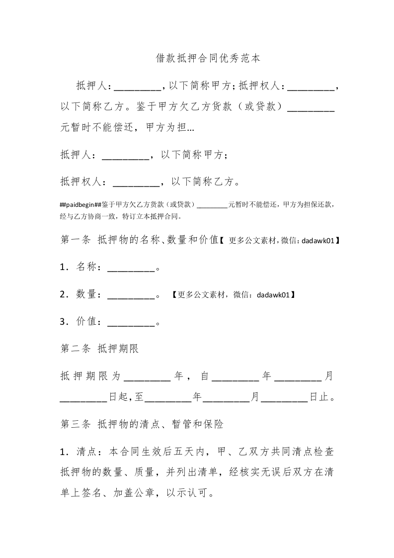 借款抵押合同优秀范本抵押人:以下简称甲方;抵押权人:以下简称乙方。鉴于甲方欠乙方货款(或贷款)元暂时不能偿还,甲方为担抵押人:以下简称甲方;抵押权人:以下简称乙方。#paidbegin#鉴于甲方欠乙方货款(或贷款)元暂时不能偿还,甲方为担保还款,经与乙方协商一致,特订立本抵押合同。第一条抵押物的名称、数量和价值【更多公文素材,微信:dadawko1】1.名称:2.数量:【更多公文素材,微信:dadawko1】3.价值:第二条抵押期限抵押期限为年,自年月日起,至年月日止。第三条抵押物的清点、暂管和保险1.清点:本合同生效后五天内,甲、乙双方共同清点检查抵押物的数量、质量,并列出清单,经核实无误后双方在清单上签名、加盖公章,以示认可。
