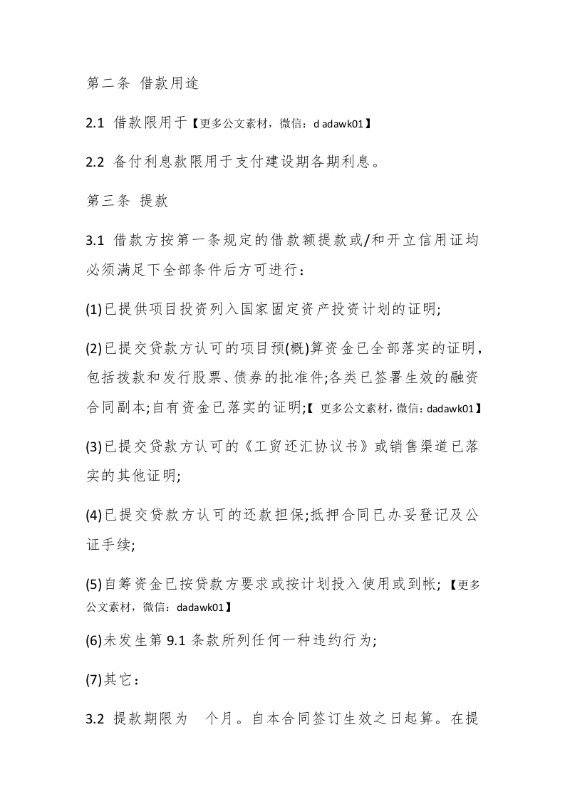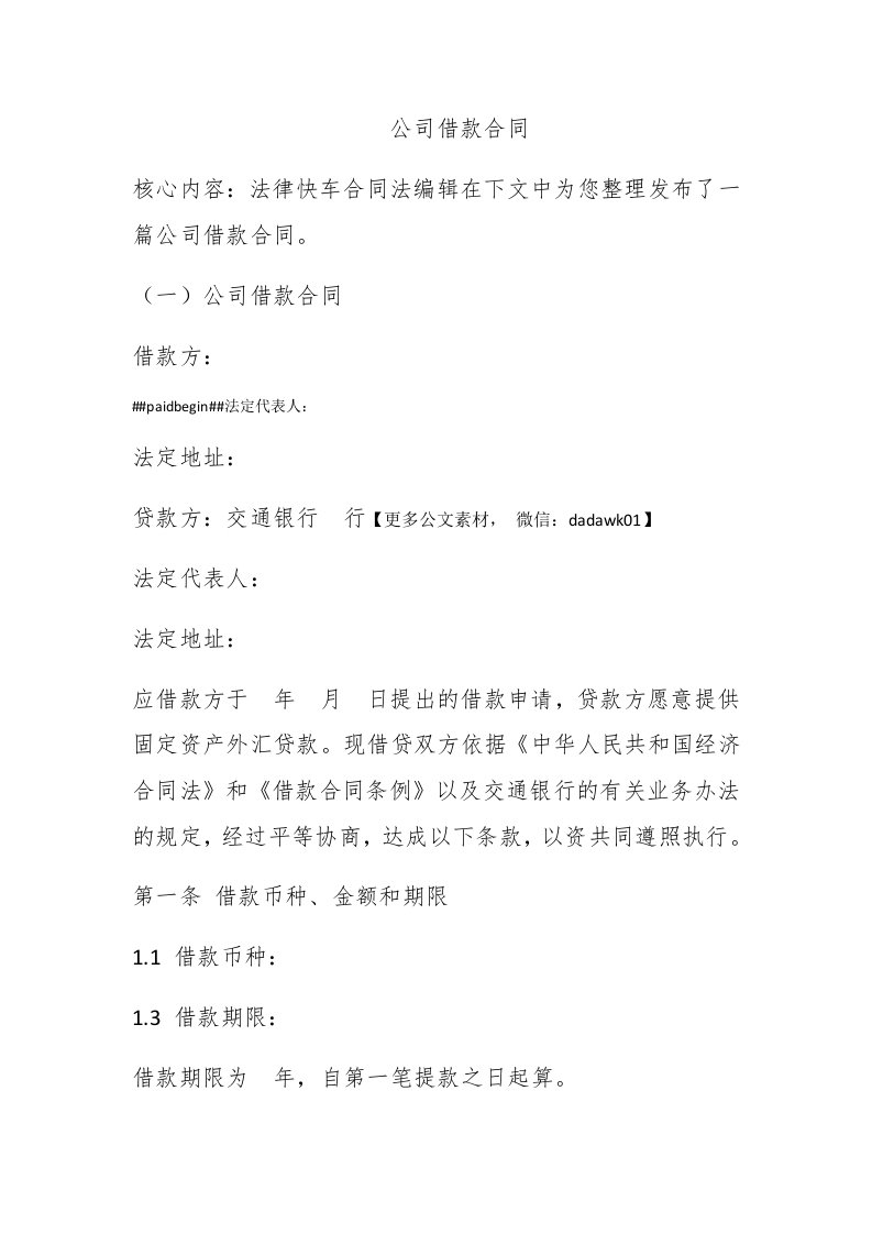 公司借款合同核心内容:法律快车合同法编辑在下文中为您整理发布了一篇公司借款合同。(一)公司借款合同借款方:#paidbegin#法定代表人:法定地址:贷款方:交通银行行【更多公文素材,微信:dadawk1】法定代表人:法定地址:应借款方于年月日提出的借款申请,贷款方愿意提供固定资产外汇贷款。现借贷双方依据《中华人民共和国经济合同法》和《借款合同条例》以及交通银行的有关业务办法的规定,经过平等协商,达成以下条款,以资共同遵照执行。第一条借款币种、金额和期限1.1借款币种:1.3借款期限:借款期限为年,自第一笔提款之日起算。