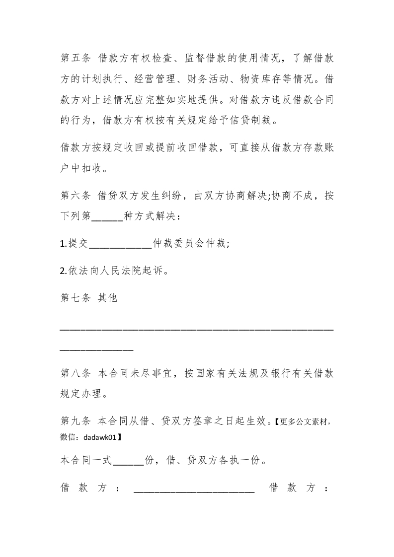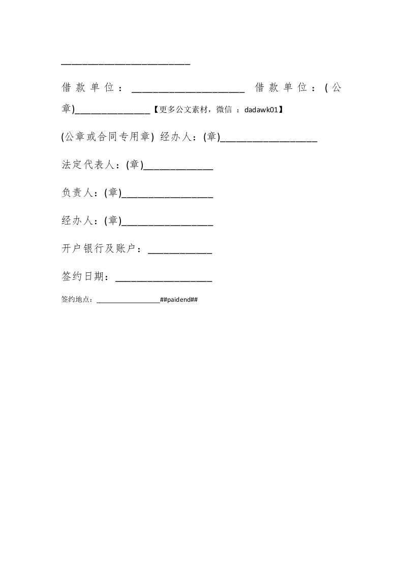 公司借款合同书范本经(下称借款方)与(下称借款方)充分协商,签订本合同,共同遵守。第一条自起,由借款方向借款方提供(种类)借款(大写)】,用于还款期限至止,利率按月息%计算。如遇国家借款利率调整,按调整后的新利率和计方法计算。具体用款、还款计划如下:…第二条借款方应在符合国家信贷政策、计划的前提下,按期、按额向借款方提供借款。否则,应按违约数额和延期天数付给借款方违约金。违约金数额的计算,与逾期借款的加息同。郴paidbegin#第三条借款方愿遵守借款方的有关借款办法规定,并按本合同规定用途使用借款。否则,借款方有权停止发放借款,收回或提前收回己发放的借款。对违约部分,按规定加收%利息。第四条借款方保证按期偿还借款本息。如需延期,借款方必须在借款到期前提出书面申请,经借款方审查同意,签订延期还款协议。wWw.HtfBw.COm借款方不申请延期或双方未签订延期还款协议的,从逾期之日起,借款方按规定加收%的利息,并可随时从借款方存款账户中直接扣收逾期借款本息。
