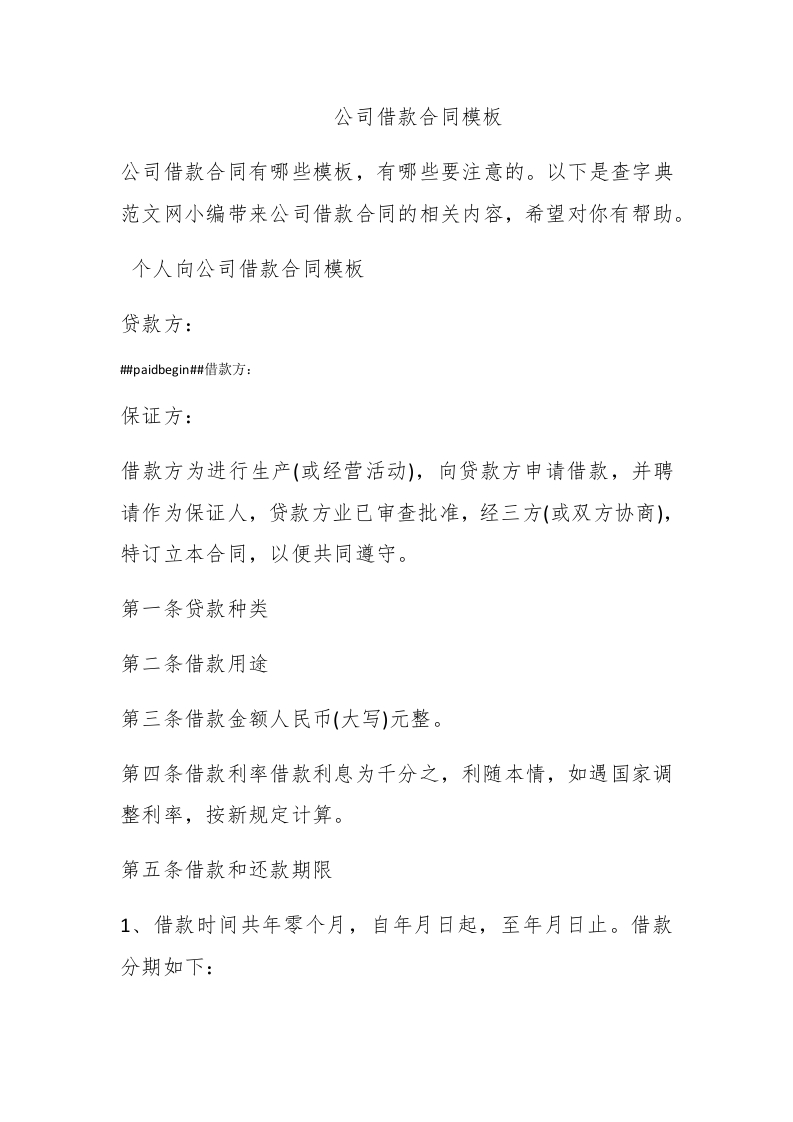 公司借款合同模板公司借款合同有哪些模板,有哪些要注意的。以下是查字典范文网小编带来公司借款合同的相关内容,希望对你有帮助。个人向公司借款合同模板贷款方:#paidbegin#借款方:保证方:借款方为进行生产(或经营活动),向贷款方申请借款,并聘请作为保证人,贷款方业已审查批准,经三方(或双方协商),特订立本合同,以便共同遵守。第一条贷款种类第二条借款用途第三条借款金额人民币(大写)元整。第四条借款利率借款利息为千分之,利随本情,如遇国家调整利率,按新规定计算。第五条借款和还款期限1、借款时间共年零个月,自年月日起,至年月日止。借款分期如下: