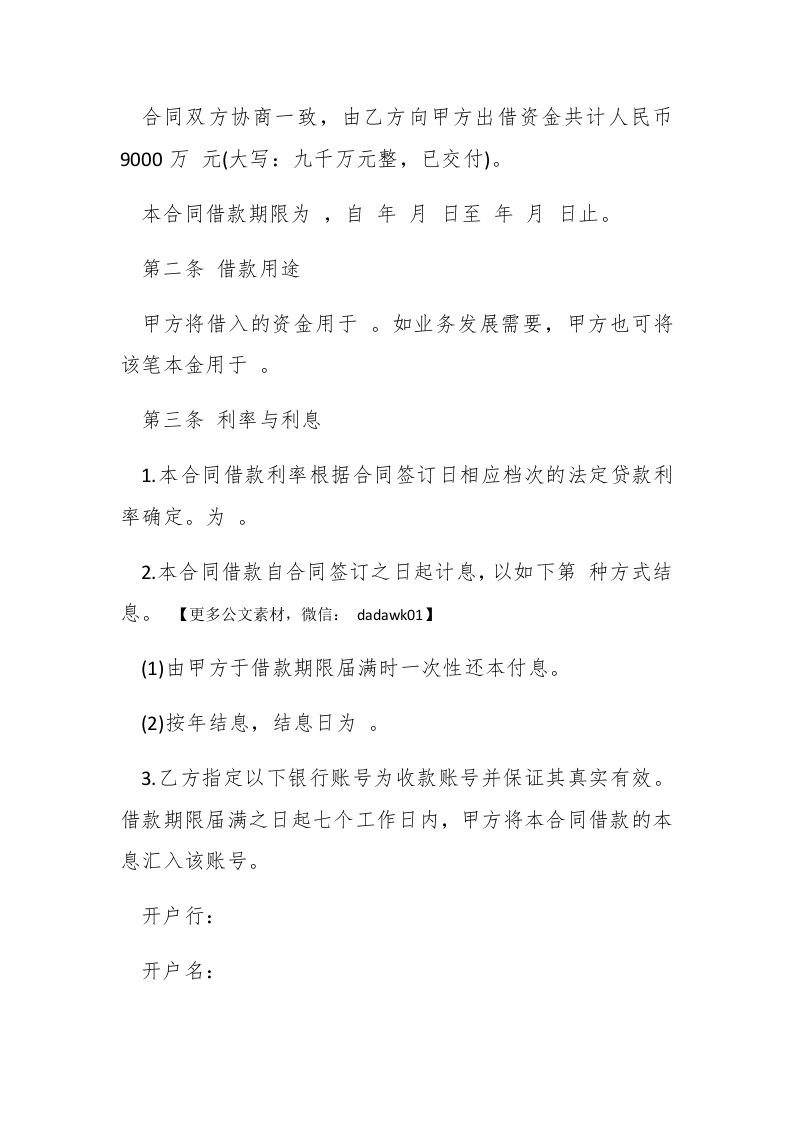 公司借款合同范本怎么写公司借款合同范本怎么写?以下就为您提供一份范本参考,希望对你有所帮助!公司借款合同范本合同编号:【更多公文素材,微信:dadawk01】#paidbegin#签订地点:借款人(以下简称甲方):法定代表人:委托代理人:公司住所:联系电话:邮编:贷款人(以下简称乙方):法定代表人:委托代理人:公司住所:联系电话:邮编:甲乙双方本着平等、自愿和诚实信用原则,就上述借款事宜达成一致。特订立本合同,供双方恪守履行。第一条借款金额与期限