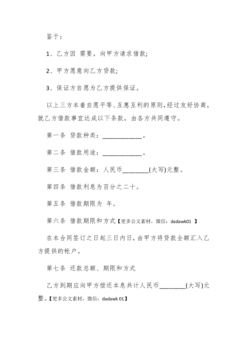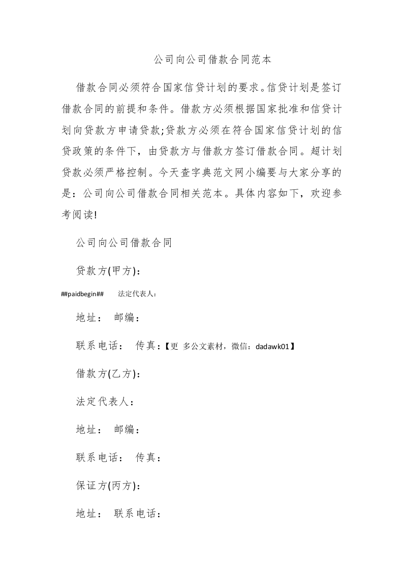 公司向公司借款合同范本借款合同必须符合国家信贷计划的要求。信贷计划是签订借款合同的前提和条件。借款方必须根据国家批准和信贷计划向贷款方申请贷款;贷款方必须在符合国家信贷计划的信贷政策的条件下,由贷款方与借款方签订借款合同。超计划贷款必须严格控制。今天查字典范文网小编要与大家分享的是:公司向公司借款合同相关范本。具体内容如下,欢迎参考阅读!公司向公司借款合同贷款方(甲方):#paidbegin##法定代表人:地址:邮编:联系电话:传真:【更多公文素材,微信:dadawk01】借款方(乙方):法定代表人:地址:邮编:联系电话:传真:保证方(丙方):地址:联系电话: