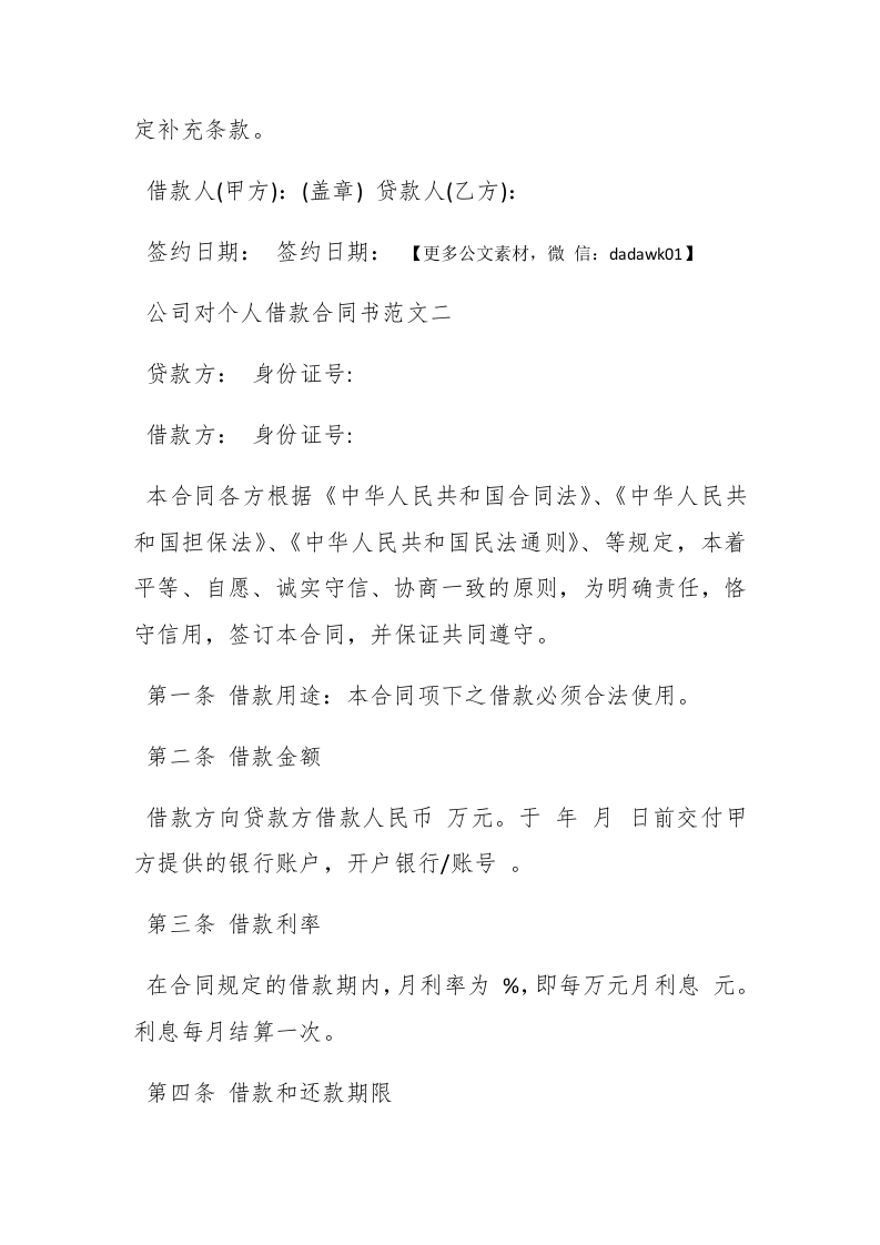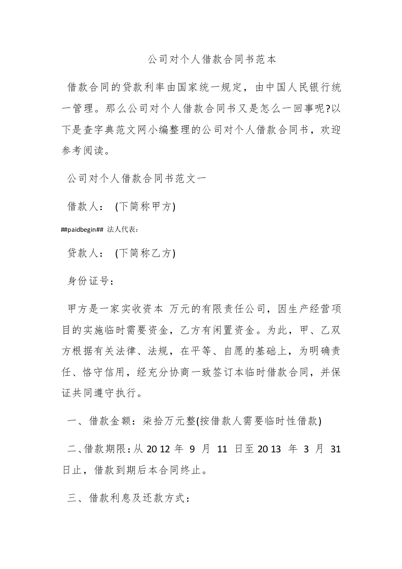 公司对个人借款合同书范本借款合同的贷款利率由国家统一规定,由中国人民银行统一管理。那么公司对个人借款合同书又是怎么一回事呢?以下是查字典范文网小编整理的公司对个人借款合同书,欢迎参考阅读。公司对个人借款合同书范文一借款人:(下简称甲方)排paidbegin#法人代表:贷款人:(下简称乙方)身份证号:甲方是一家实收资本万元的有限责任公司,因生产经营项目的实施临时需要资金,乙方有闲置资金。为此,甲、乙双方根据有关法律、法规,在平等、自愿的基础上,为明确责任、恪守信用,经充分协商一致签订本临时借款合同,并保证共同遵守执行。一、借款金额:柒拾万元整(按借款人需要临时性借款)二、借款期限:从2012年9月11日至2013年3月31日止,借款到期后本合同终止。三、借款利息及还款方式: