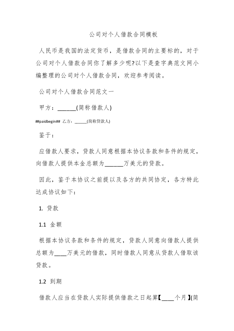 公司对个人借款合同模板人民币是我国的法定货币,是借款合同的主要标的,对于公司对个人借款合同你了解多少呢?以下是查字典范文网小编整理的公司对个人借款合同,欢迎参考阅读。公司对个人借款合同范文一甲方:(简称借款人)】#paidbegin#乙方:(简称贷款人)鉴于:应借款人要求,贷款人同意根据本协议条款和条件的规定,向借款人提供本金总额为万美元的贷款。因此,鉴于本协议之前提以及各方的共同协定,各方特此达成协议如下:1.贷款1.1金额根据本协议条款和条件的规定,贷款人同意向借款人提供总额为万美元的借款,同时借款人同意从贷款人借取该贷款。1.2到期借款人应当在贷款人实际提供借款之日起算【个月】(简