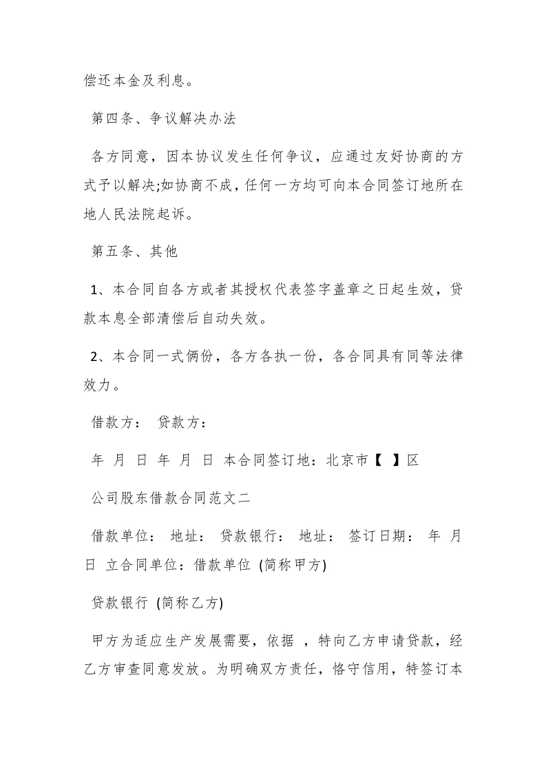 公司股东借款合同优秀样本借款合同是借款人向贷款人借款,到期返还借款并支付利息的合同。公司股东借款合同怎么写呢?以下是查字典范文网小编整理的公司股东借款合同,欢迎参考阅读。公司股东借款合同范文一借款方:身份证号码:糊paidbegin#贷款方:法定代表人:地址:【更多公文素材,微信:dadawko1】借款方为进行经营活动,向贷款方申请借款,经双方协商,为明确责任,恪守信用,特签订本合同,共同信守。第一条、借款金额和用途借款方向贷款方申请借款人民币(大写)【】万元。第二条、借款期限和利息借款期限共【】个月,自20Xx年【】月【】日起,至【】年【】月【】日止。利率按借款合同期限确定年息为【】,按季收取利息。贷款逾期除限期追收外,按规定从逾期之日起加收利息【】%,并按逾期后的利率档次重新确定借款利率。第三条、还款期限借款方应于借款期限届满之日起【】日内一次性向贷款方
