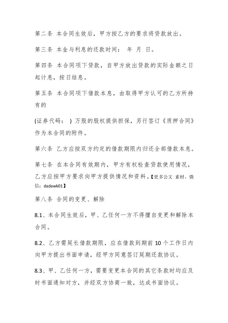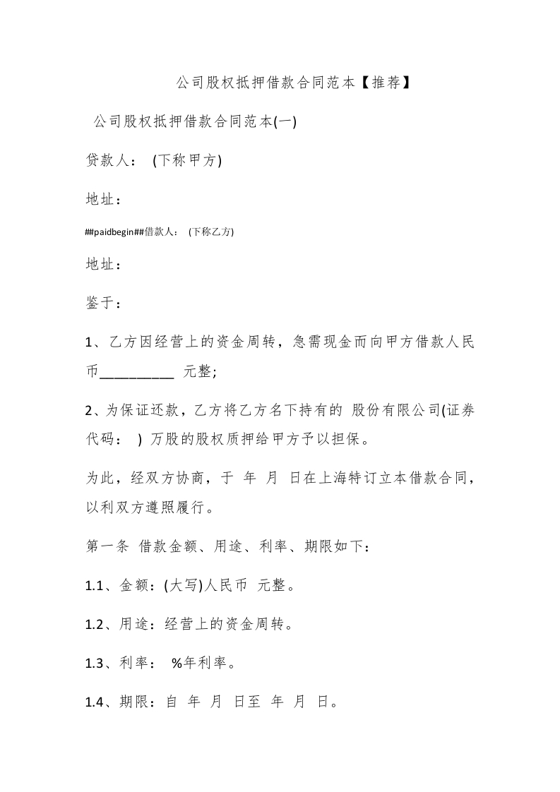 公司股权抵押借款合同范本【推荐】公司股权抵押借款合同范本(一)贷款人:(下称甲方)地址:郴paidbegin#借款人:(下称乙方)地址:鉴于:1、乙方因经营上的资金周转,急需现金而向甲方借款人民币元整;2、为保证还款,乙方将乙方名下持有的股份有限公司(证券代码:)万股的股权质押给甲方予以担保。为此,经双方协商,于年月日在上海特订立本借款合同,以利双方遵照履行。第一条借款金额、用途、利率、期限如下:1.1、金额:(大写)人民币元整。1.2、用途:经营上的资金周转。1.3、利率:%年利率。1.4、期限:自年月日至年月日。