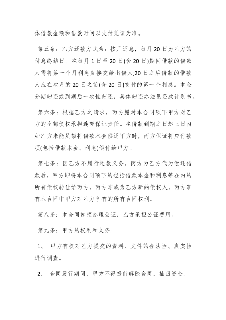 公司贷款借款合同范本合同(或合约)(covenants),是双方当事人基于对立合致的意思表示而成立的法律行为,为私法自治的主要表现,意指盖印合约中所包含的合法有效承诺或保证。本文是关于公司贷款借款合同范本,仅供大家参考。甲方(出借人)】身份证号码:乙方(借款人)】身份证号码:公司地址:营业执照号注册号:#paidbegin#丙方(担保人)」法定代表人:地址:电话:营业执照号码:根据《中华人民共和国合同法》及《中华人民共和国担保法》等有关法律法规的规定,当事人在平等自愿、诚实信用的基础上,经协商一致,签订本合同。第一条:甲方(出借人)出借人民币期限个月,自年月日至年月日止。借款期限届满日为法定节假日、休息日的,顺延至节假日、休息日后的第一个工作日,利息按实际占有天数计算。第二条:借款利率为月息,从出资人实际交付借款之日起计息至本金结清之日。第三条:乙方借款用途为经营周转。乙方承诺合法使用借款,不得用作违法活动。第四条:甲方应在合同签订后当日,一次性向乙方交付全部借款。具