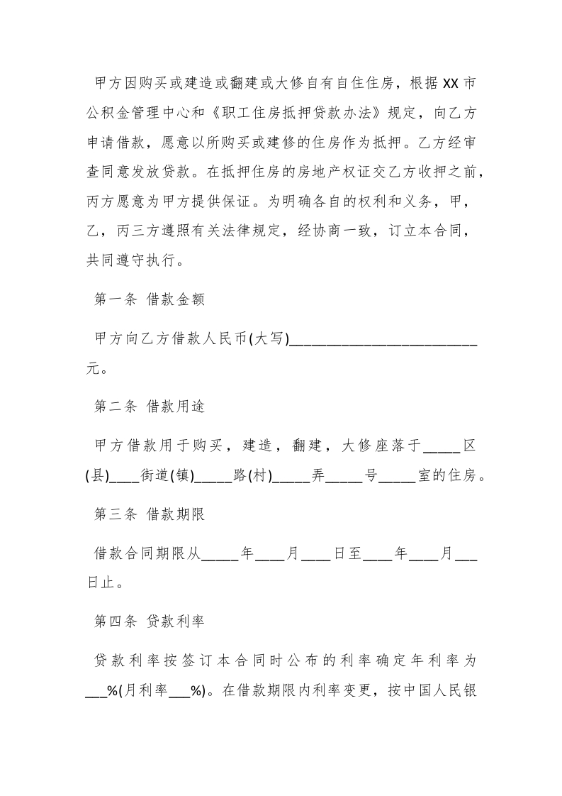 公积金借款合同范本公积金贷款是指缴存住房公积金的职工享受的贷款,国家规定,凡是缴存公积金的职工均可按公积金贷款的相关规定申请个人住房公积金贷款。20Xx年8月31日,由住建部等联合发布通知称,自20XX年9月1日起起公积金贷款买二套房首付降至2成。今天查字典范文网小编就为大家精心准备了:公积金借款合同相关范本。具体内容如下,仅供参考,希望能帮助到大家!个人公积金借款合同脚paidbegin#货款种类:合同编号:借款人:电话:住址:邮政编码:货款银行:电话:法定代表人:传真:地址:邮政编码:借款人即抵押人(以下简称甲方):贷款人即抵押权人(以下简称乙方):保证人即售房单位(以下简称丙方):