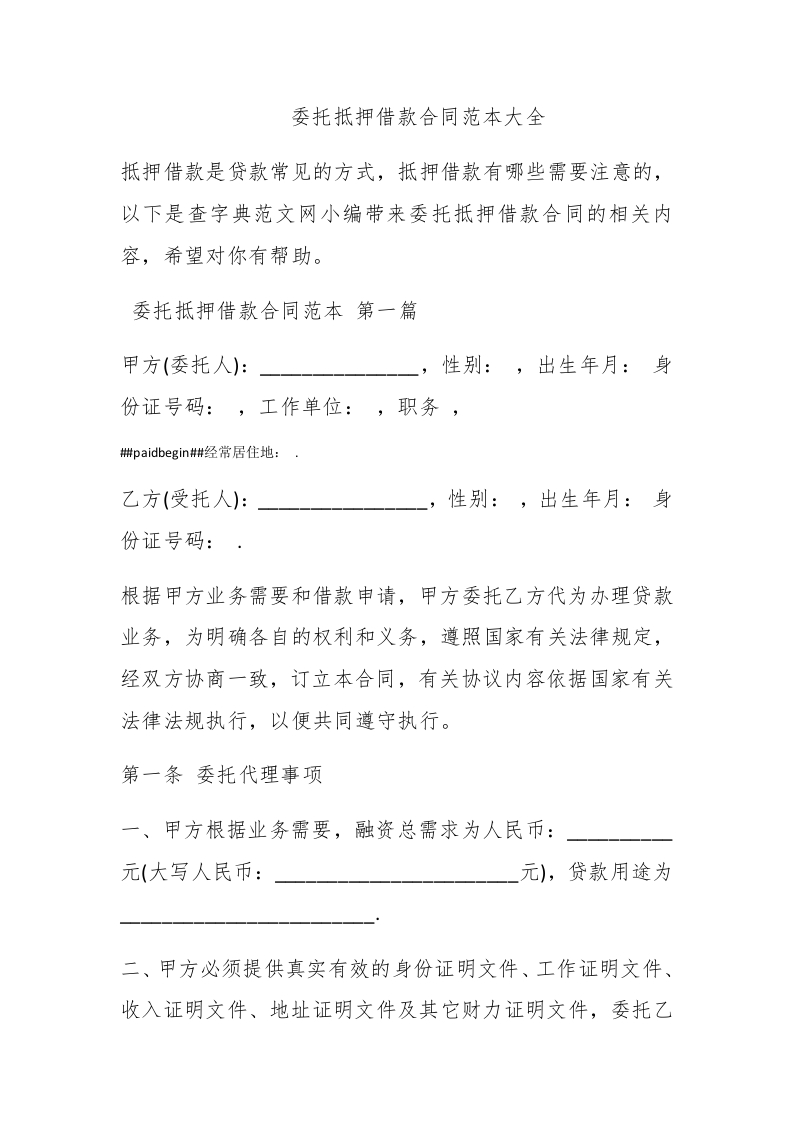 委托抵押借款合同范本大全抵押借款是贷款常见的方式,抵押借款有哪些需要注意的,以下是查字典范文网小编带来委托抵押借款合同的相关内容,希望对你有帮助。委托抵押借款合同范本第一篇甲方(委托人),性别:,出生年月:身份证号码:,工作单位:,职务,#paidbegin#经常居住地:乙方(受托人):性别:,出生年月:身份证号码:根据甲方业务需要和借款申请,甲方委托乙方代为办理贷款业务,为明确各自的权利和义务,遵照国家有关法律规定,经双方协商一致,订立本合同,有关协议内容依据国家有关法律法规执行,以便共同遵守执行。第一条委托代理事项一、甲方根据业务需要,融资总需求为人民币:元(大写人民币:元),贷款用途为二、甲方必须提供真实有效的身份证明文件、工作证明文件、收入证明文件、地址证明文件及其它财力证明文件,委托乙