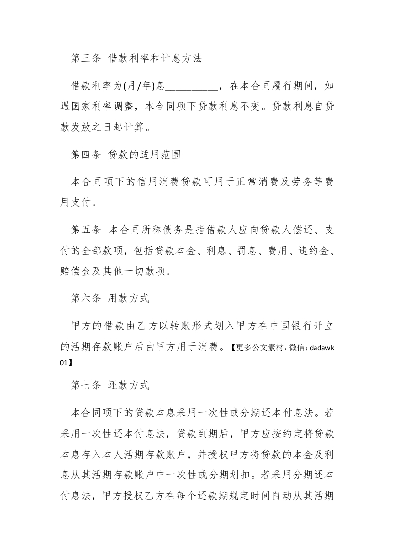 小额信用消费贷款借款合同书xmtt885个月前发布关注私信18.50KB10页0555 第1页 / 共10页 第2页 / 共10页 第3页 / 共10页 试读已结束,还剩7页,您可下载完整版后进行离线阅读 小额信用消费贷款借款合同书此内容为付费资源,请付费后查看¥1会员服务免费立即购买您当前未登录!建议登陆后购买,可保存购买订单付费资源© 版权声明文章版权归作者所有,未经允许请勿转载。THE END借款协议 文本预览 小额信用消费贷款借款合同书消费贷款也叫消费者贷款,主要指的是用于留学贷款、房屋装修、购买耐用品乃至买车等方面的个人贷款,从种类上看,消费贷款包括住宅抵押贷款、非住房贷款和信用卡贷款。小编今天整理了一份小额信用消费贷款借款合同书,仅供参考!希望对你有帮助!小额信用消费贷款借款合同书合同编号:年字第号郴paidbegin#借款人:住所:身份证号码:电话:邮政编码:开户银行及账号:长城卡卡号:有效期:贷款人:住所: 查看更多 收起部分 喜欢就支持一下吧点赞5 分享QQ空间微博QQ好友海报分享复制链接收藏