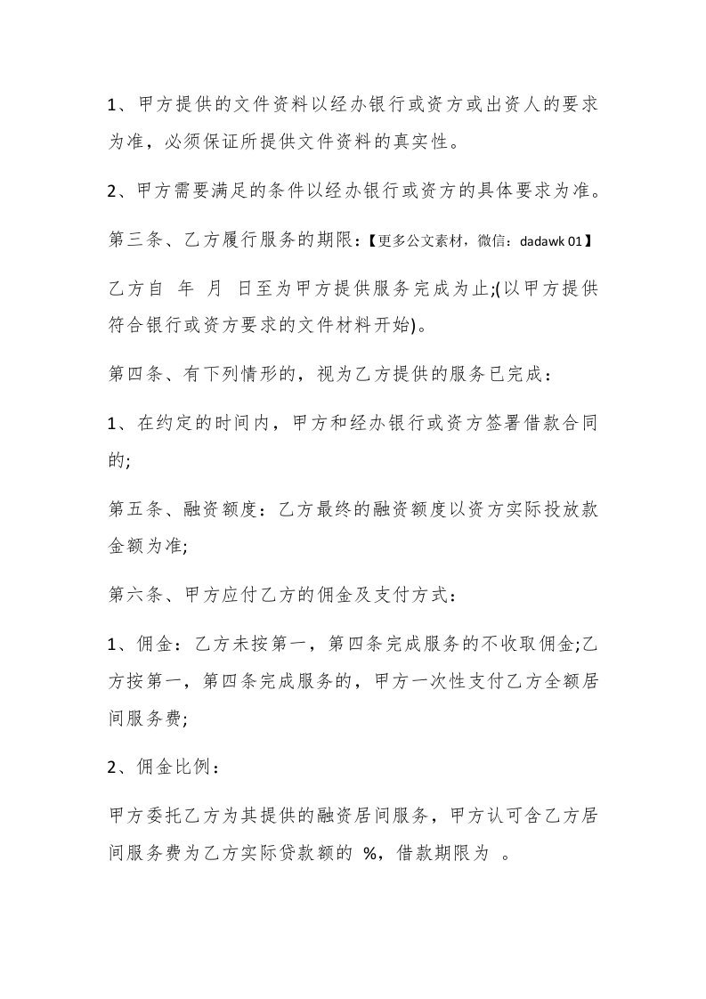 房地产借款融资居间合同范本居间业务根据居间人所受委托内容的不同,可分为指示居间和媒介居间。前者指居间人仅为委托人报告订约机会的居间;后者指居间人仅为委托人为订约媒介的居间。无论何种居间,居间人都只是居于交易双方当事人之间起介绍、协助作用的中间人。在大陆法国家的立法上,采民商分立的国家,一般有以商法调整媒介居间,以民法调整指示居间的区分。房地产借款融资居间合同范本1甲方(委托人)#paidbegin#乙方(被委托人)依据《中华人民共和国合同法》及有关规定,经双方协商,特就下列乙方向甲方提供相关服务事宜达成一致,具体如下:第一条、服务内容:1、乙方向甲方提供融资信息咨询;并负责寻找能解决甲方资金需求的经办银行或相关资方,联系安排甲方与经办银行或相关资方或出资人方直接见面洽谈。2、乙方促成甲方与经办银行或相关资方签署借款合同(经办银行或资方或出资人以甲方的需求及实际情况另外确定,同一银行系统或信贷机构视为同一经办方)第二条、甲方提供的文件及需要满足的其他条件: