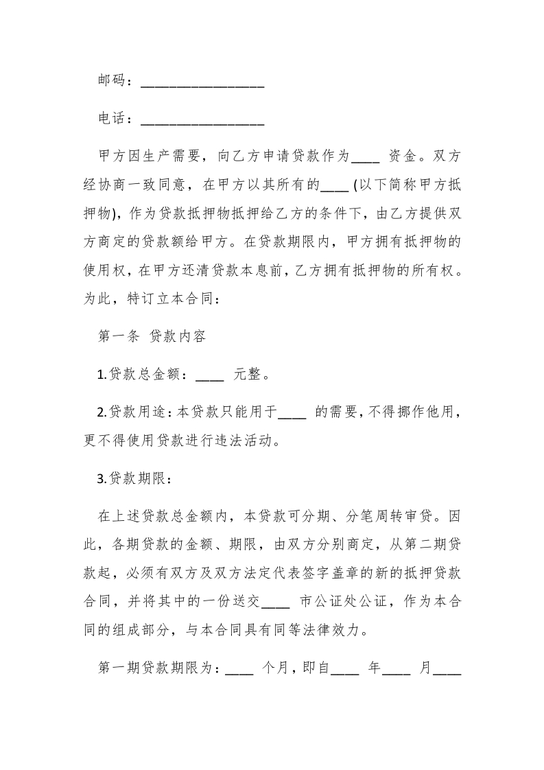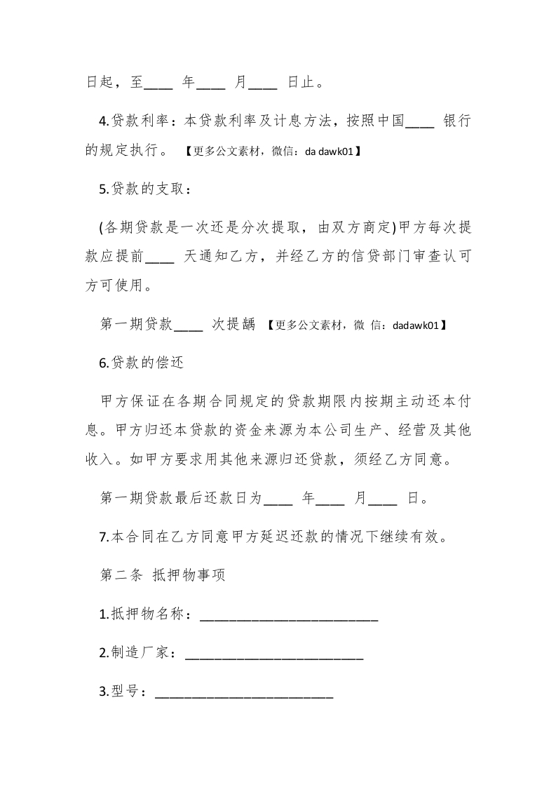 抵押物的借款合同范本20XX抵押贷款指借款者以一定的抵押品作为物品保证向银行取得的贷款。它是银行的一种放款形式、抵押品通常包括有价证券、国债券、各种股票、房地产、以及货物的提单、栈单或其他各种证明物品所有权的单据。贷款到期,借款者必须如数归还,否则银行有权处理抵押品,作为一种补偿。下面小编就为大家介绍抵押物的借款合同,希望可以帮到你!抵押物的借款合同范本贷款抵押人(以下简称甲方)郴paidbegin#法定代表人:职务:地址:邮码:【更多公文素材,微信:dada wk01】电话:贷款抵押权人(以下简称乙方)》法定代表人:职务:地址: