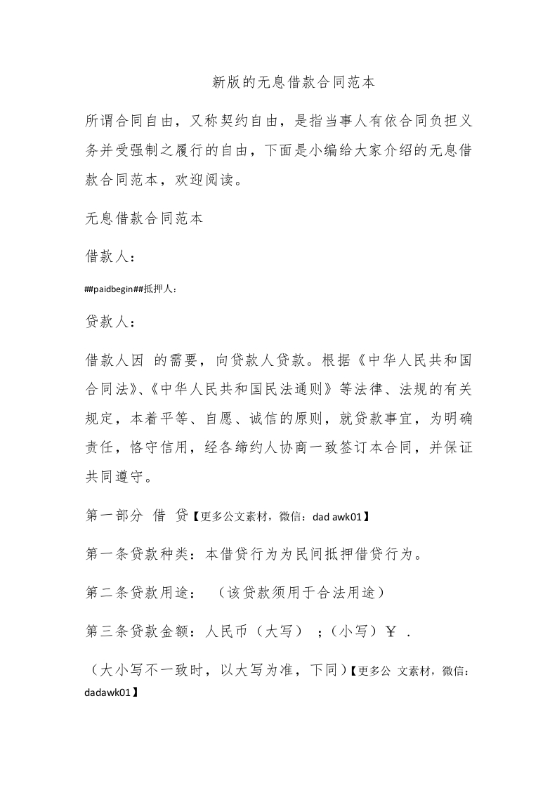 新版的无息借款合同范本所谓合同自由,又称契约自由,是指当事人有依合同负担义务并受强制之履行的自由,下面是小编给大家介绍的无息借款合同范本,欢迎阅读。无息借款合同范本借款人:#paidbegin#抵押人:贷款人:借款人因的需要,向贷款人贷款。根据《中华人民共和国合同法》、《中华人民共和国民法通则》等法律、法规的有关规定,本着平等、自愿、诚信的原则,就贷款事宜,为明确责任,恪守信用,经各缔约人协商一致签订本合同,并保证共同遵守。第一部分借贷【更多公文素材,微信:dad awko1】第一条贷款种类:本借贷行为为民间抵押借贷行为。第二条贷款用途:(该贷款须用于合法用途)第三条贷款金额:人民币(大写);(小写)¥·(大小写不一致时,以大写为准,下同)【更多公文素材,微信:dadawk01】