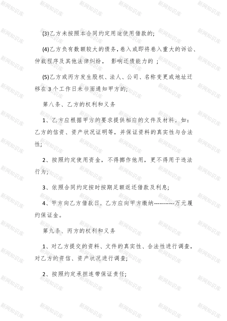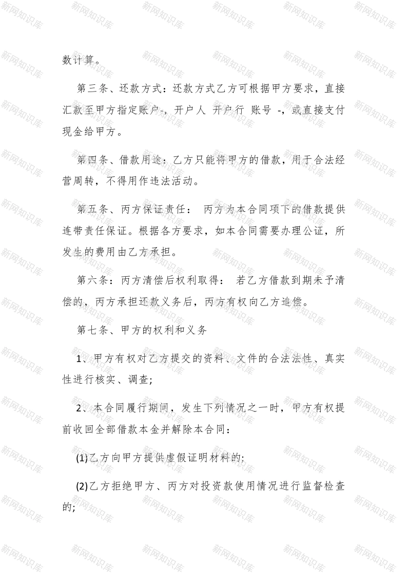 最新短期借款合同范本三篇汇总荐读合同是当事人或当事双方之间设立、变更、终止民事关系的协议,依法成立的合同,受法律保护。下文是查字典范文网小编整理的最新短期借款合同范本三篇汇总荐读,希望内容对您有帮助。范本一甲方(出借人):#paidbegin##乙方(借款人):丙方(担保人):本合同各方根据相关法律法规,在平等自愿、诚实信用的基础上,经共同协商,甲方借款给乙方,丙方自愿为乙方提供担保,丙方自愿为乙方提供连带责任,三方对合同条款达成协议如下:第一条、借款金额:甲方借给乙方金额为人民币(大写)元,借款期限个月,自20XX年月日至20年月日止。实际日期以借据为准。第二条、借款利息:按甲方借款数额的计算,甲方在合同签订日扣除借款利息,乙方在借款期限到期后最后一日返还全部本金。到期若遇节假日、休息日,顺延至节假日、休息日后的第一个工作日,利息按实际使用天