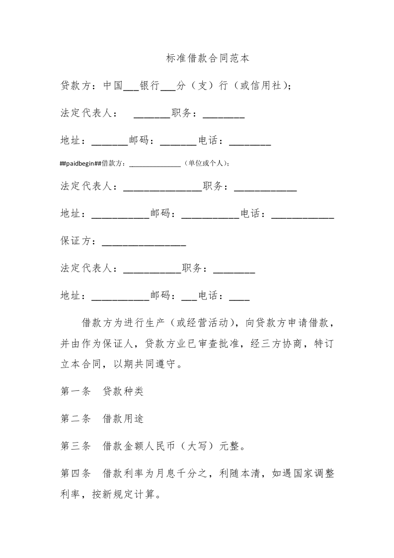 标准借款合同范本贷款方:中国银行分(支)行(或信用社):法定代表人:职务:地址:邮码:电话:#paidbegin#借款方:(单位或个人):法定代表人:职务:地址:邮码:电话:保证方:法定代表人:职务:地址:邮码:电话:借款方为进行生产(或经营活动),向贷款方申请借款,并由作为保证人,贷款方业已审查批准,经三方协商,特订立本合同,以期共同遵守。第一条贷款种类第二条借款用途第三条借款金额人民币(大写)元整。第四条借款利率为月息千分之,利随本清,如遇国家调整利率,按新规定计算。