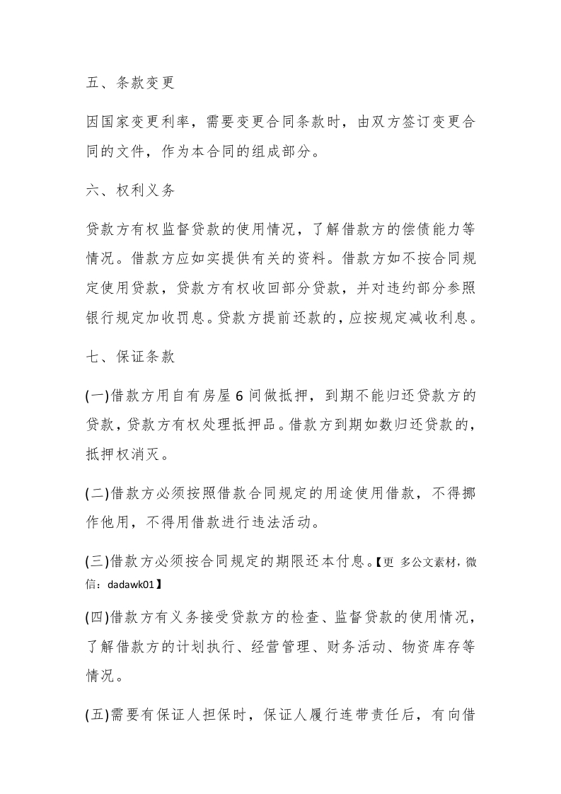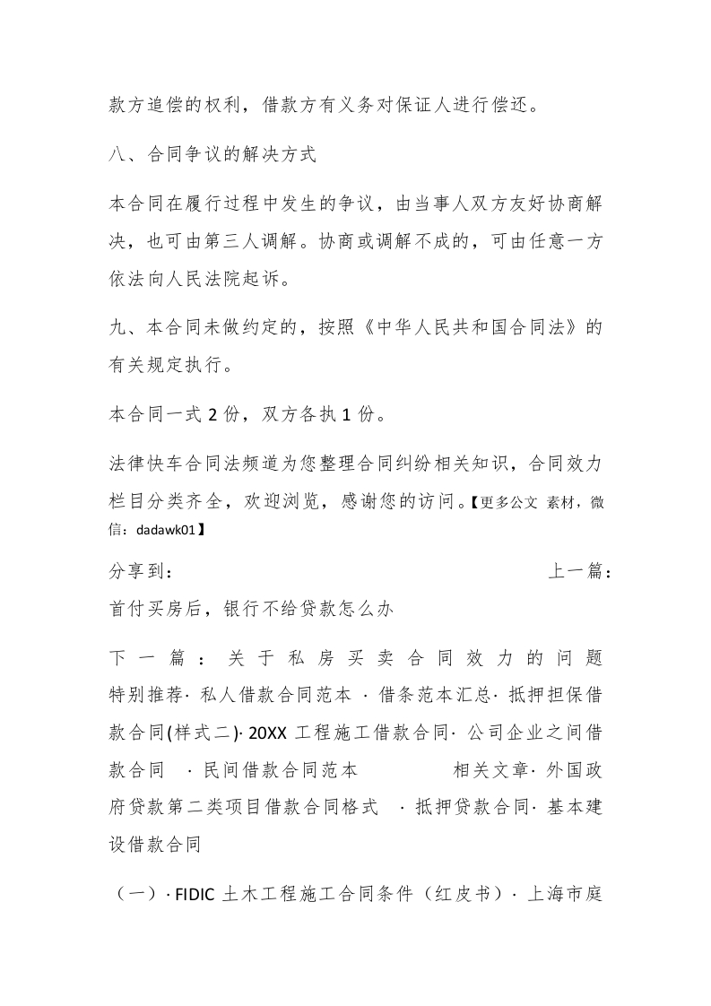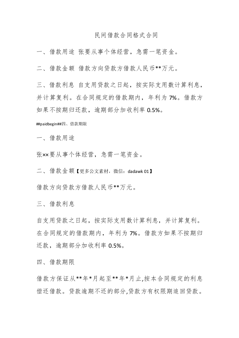 民间借款合同格式合同一、借款用途张要从事个体经营,急需一笔资金。二、借款金额借款方向贷款方借款人民币*万元。三、借款利息自支用贷款之日起,按实际支用数计算利息,并计算复利。在合同规定的借款期内,年利为7%。借款方如果不按期归还款,逾期部分加收利率0.5%。#paidbegin#四、借款期限一、借款用途张×要从事个体经营,急需一笔资金。二、借款金额【更多公文素材,微信:dadawk01】借款方向贷款方借款人民币**万元。三、借款利息自支用贷款之日起,按实际支用数计算利息,并计算复利。在合同规定的借款期内,年利为7%。借款方如果不按期归还款,逾期部分加收利率0.5%。四、借款期限借款方保证从**年*月起至**年*月止,按本合同规定的利息偿还借款。贷款逾期不还的部分,贷款方有权限期追回贷款。